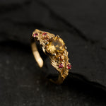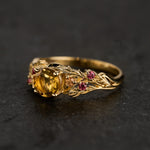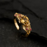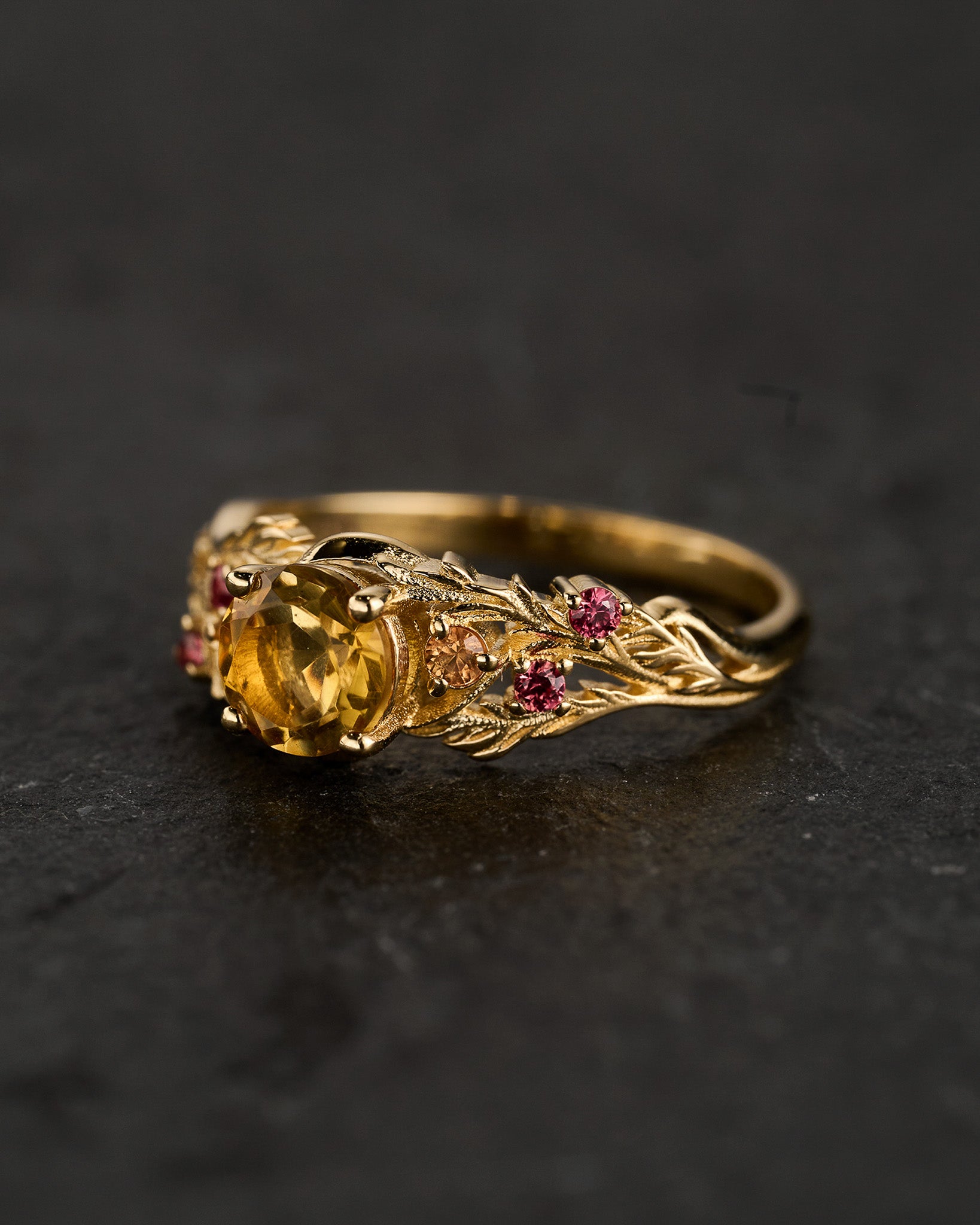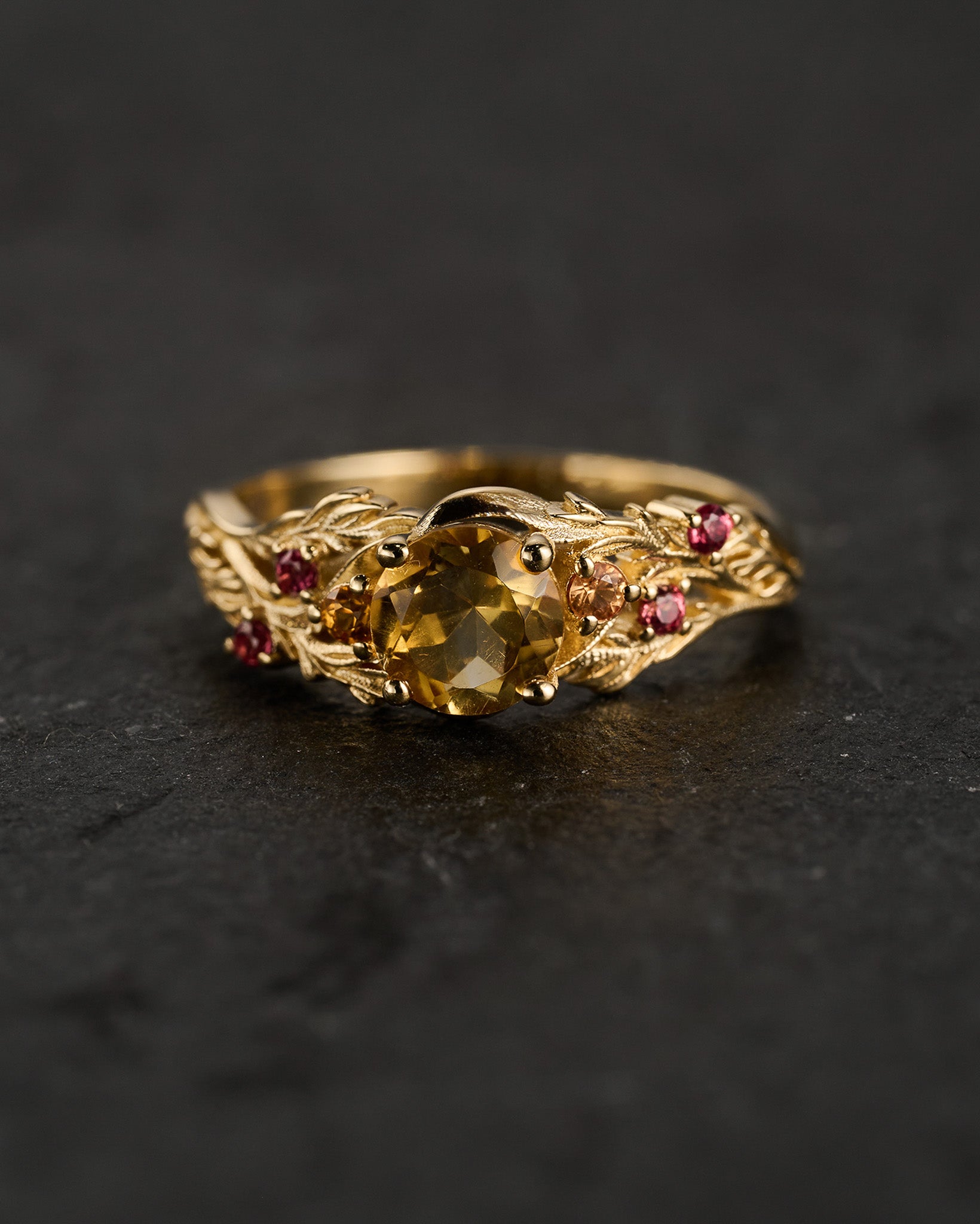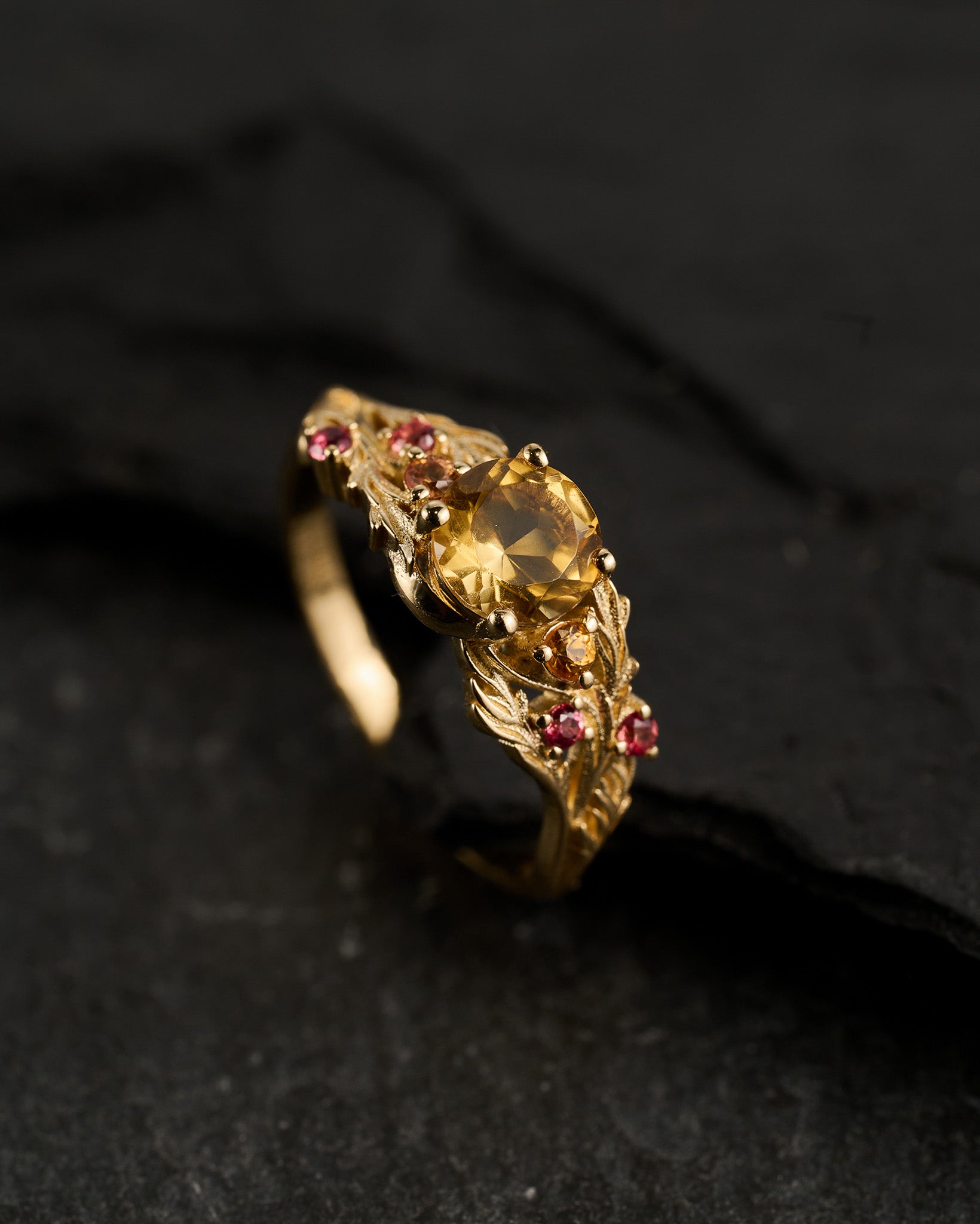 Delicately sculpted, this leaves band would be perfect for alternative engagement ring seekers. You can see Japanese maple leaves wrapping the central gemstone - natural citrine. Sparkling sapphires are scattered between gold leaves, reminding berries in the forest.