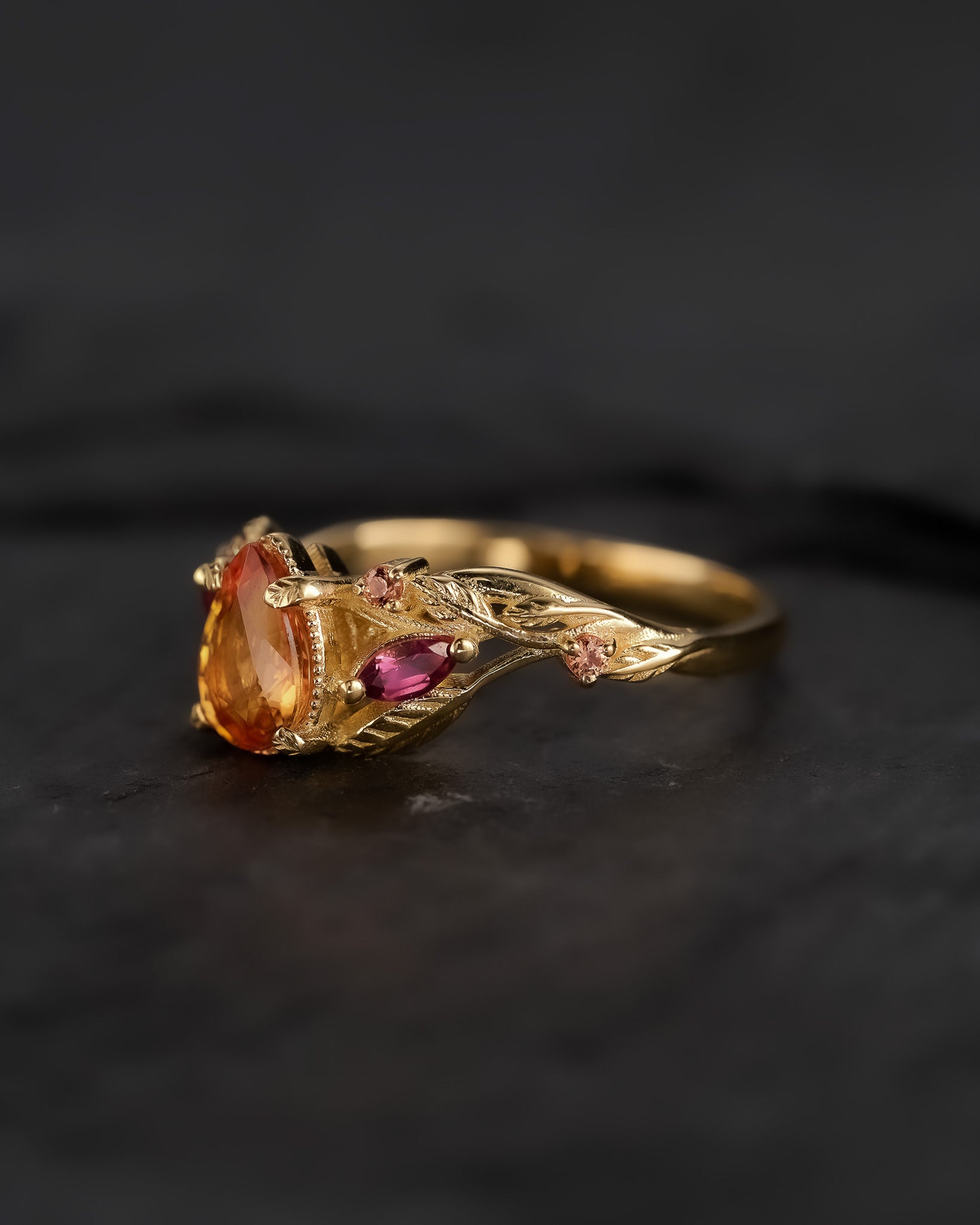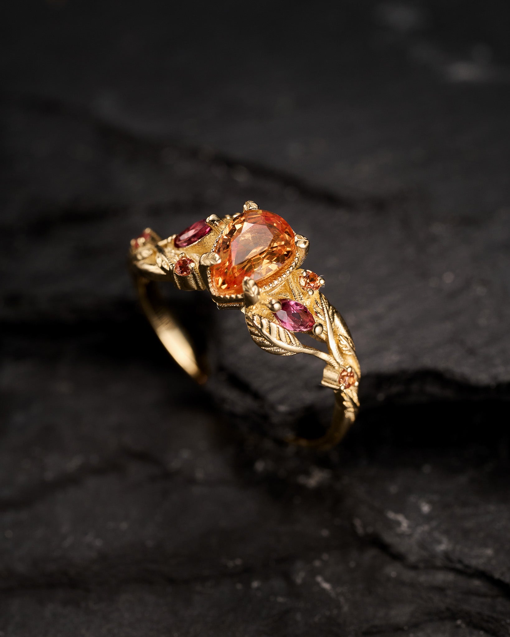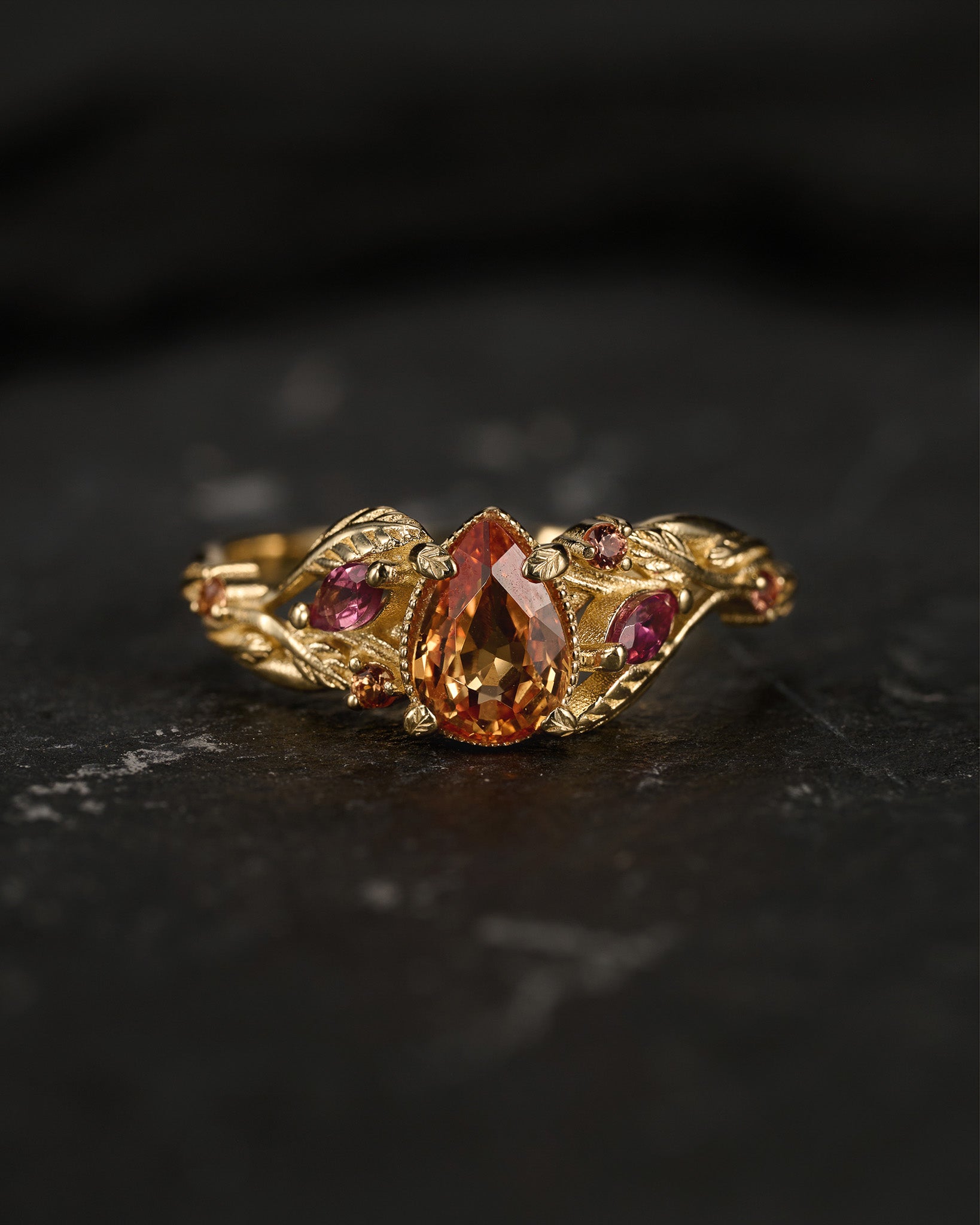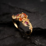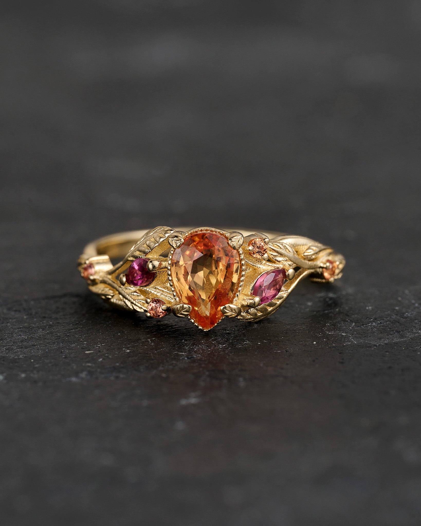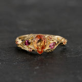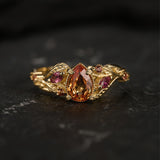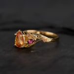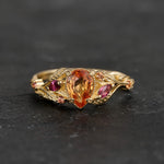 READY TO SHIP: Patricia ring in 14K yellow gold, orange sapphire, pear cut 7x5 mm, accent sapphires & tourmalines, AVAILABLE RING SIZES: 5.5 - 8.5 US