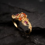 Patricia ring shows an intricate design with vines and leaves interlacing naturally. Side gemstones are scattered between twigs - marquise cut gemstones remind us of leaf shapes, and small round cuts look like shiny morning dew. The central gemstone has a beaded frame around it, which adds extra detail.