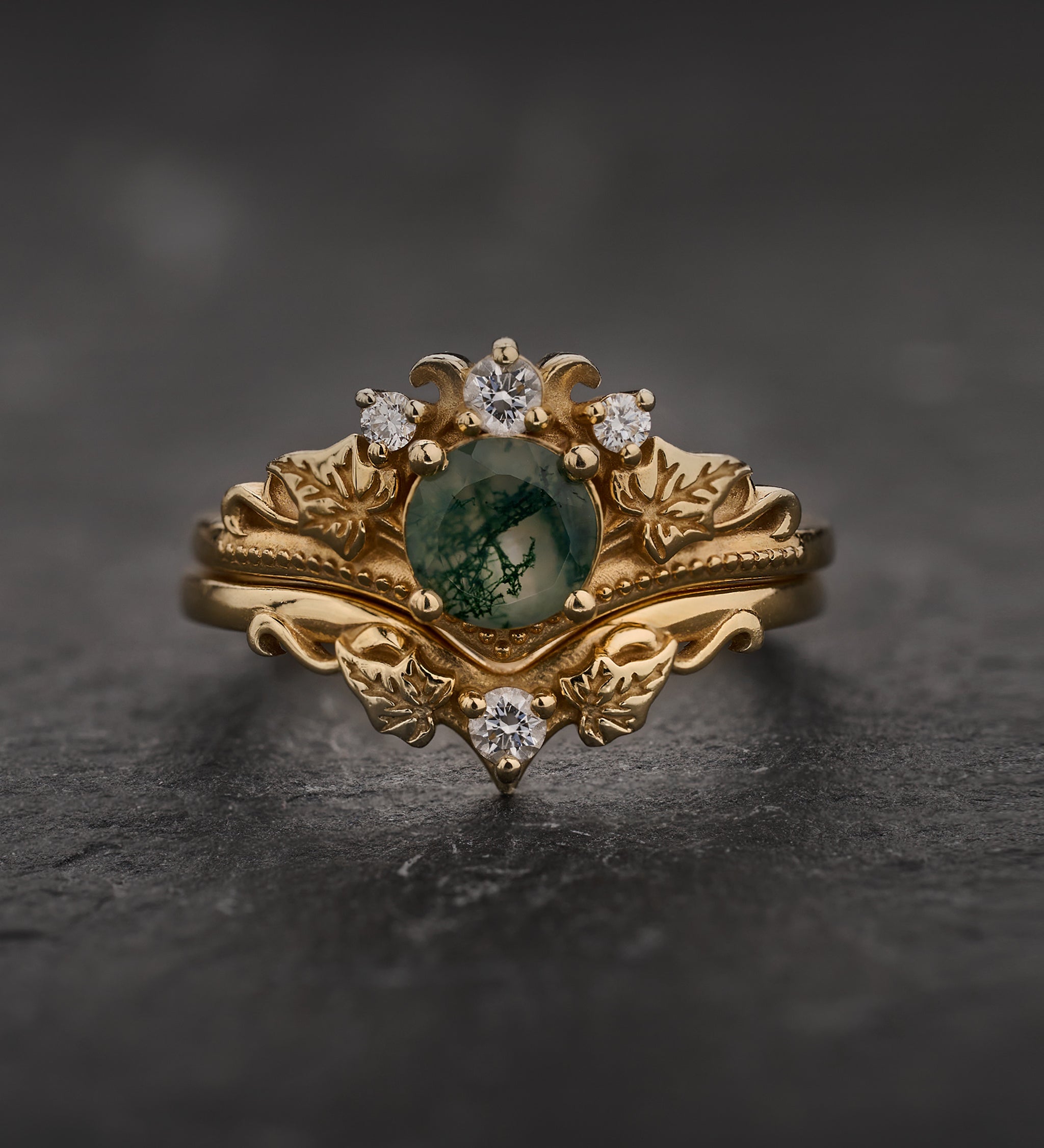 This listing is for the set of two rings: Lida engagement ring with big natural moss agate and chevron style matching band with lab-grown / natural diamonds