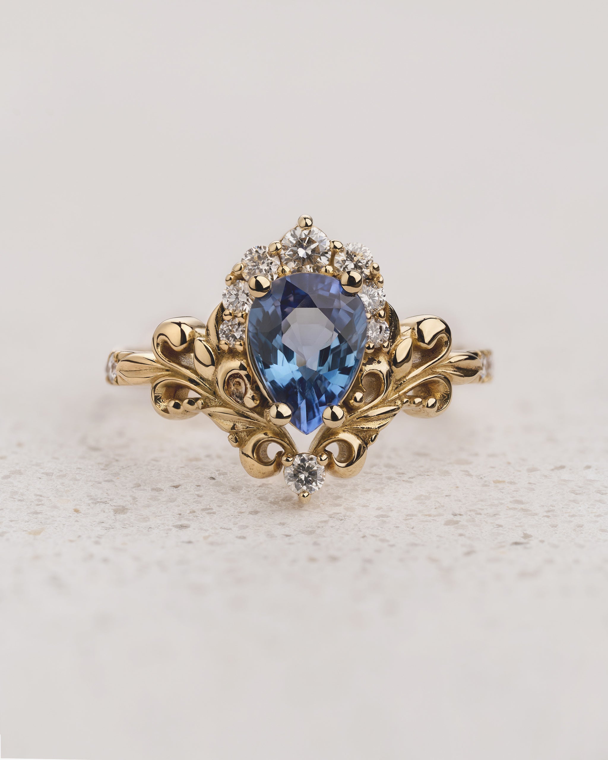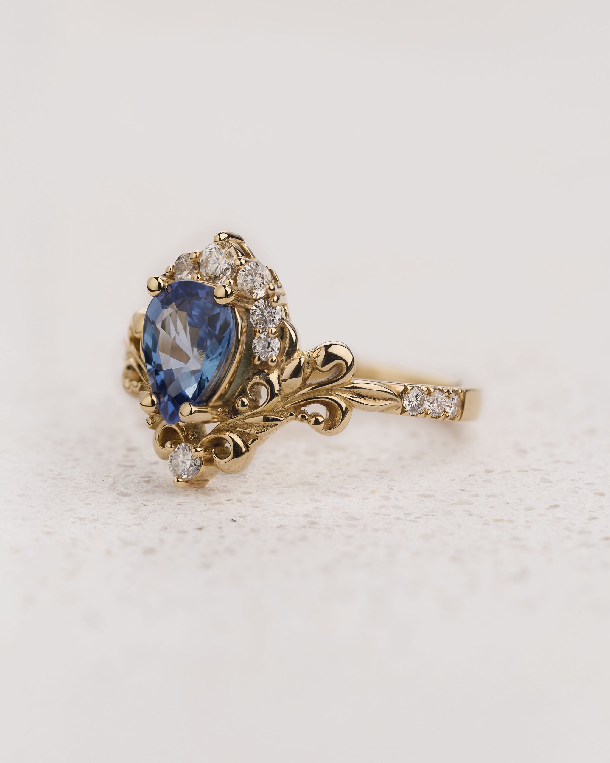 Sophisticated and well-dressed - this is our new Sophie engagement ring design. Inspired by the old works of baroque masters we created this style for the most romantic proposals. She has a rich crown and swirly foliage arranged around central pear cut gemstone. Additional diamonds on a shank’s sides are balancing the composition with a visual simplicity of the pavé setting.