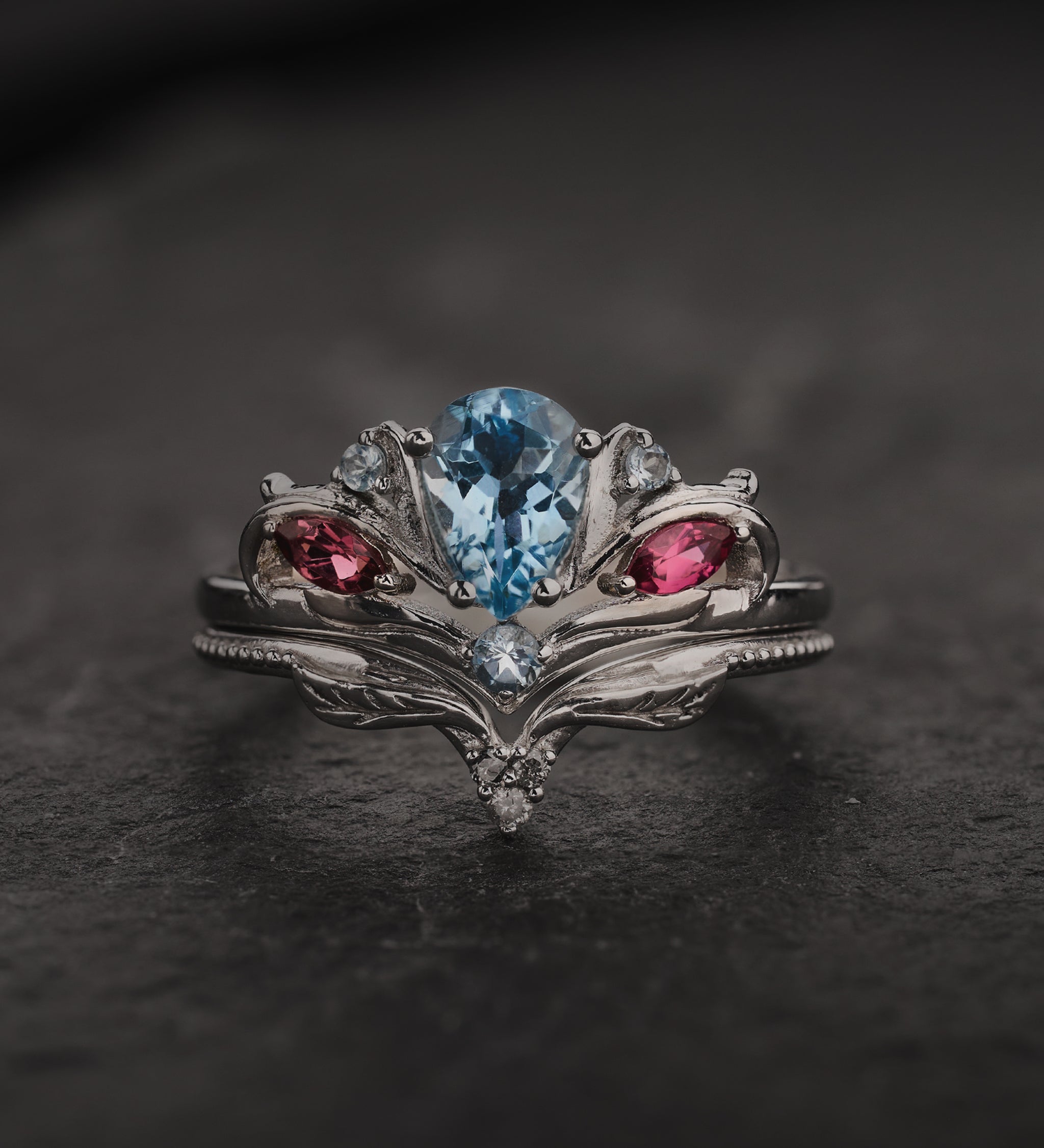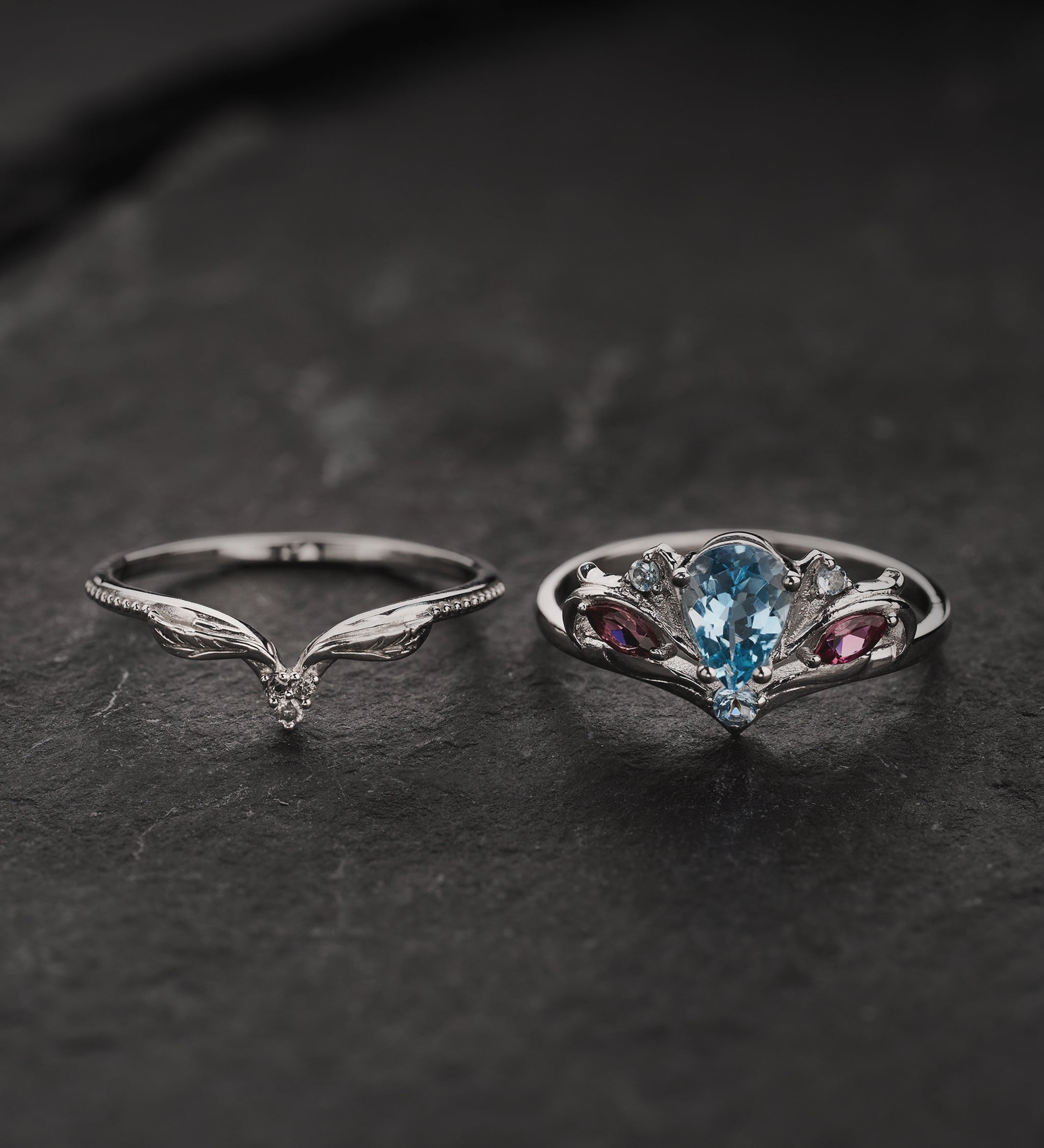 Aquamarine gold engagement ring, white gold leaves promise ring / Freesia