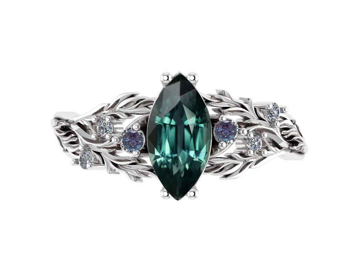 Custom order: Japanese Maple engagement ring with teal sapphire and emeralds