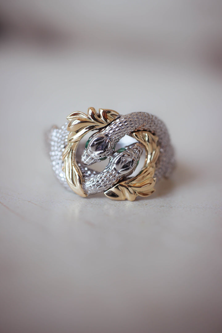Ring of Barahir in two tone gold, snakes ring with emeralds