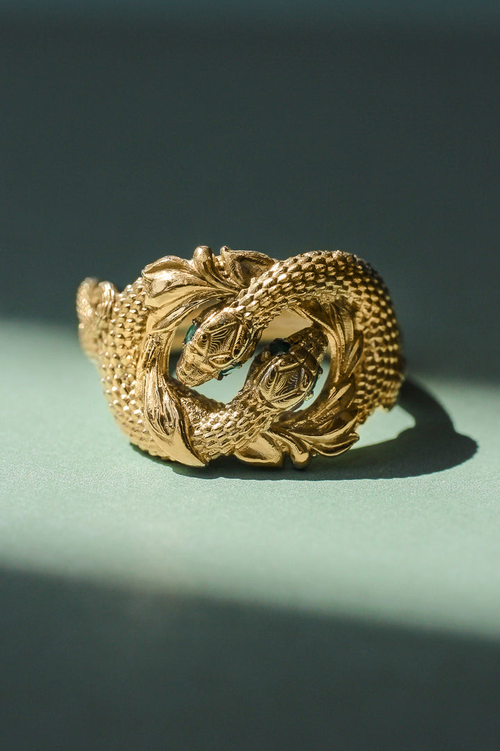 Ring of Barahir in two tone gold, snakes ring with emeralds