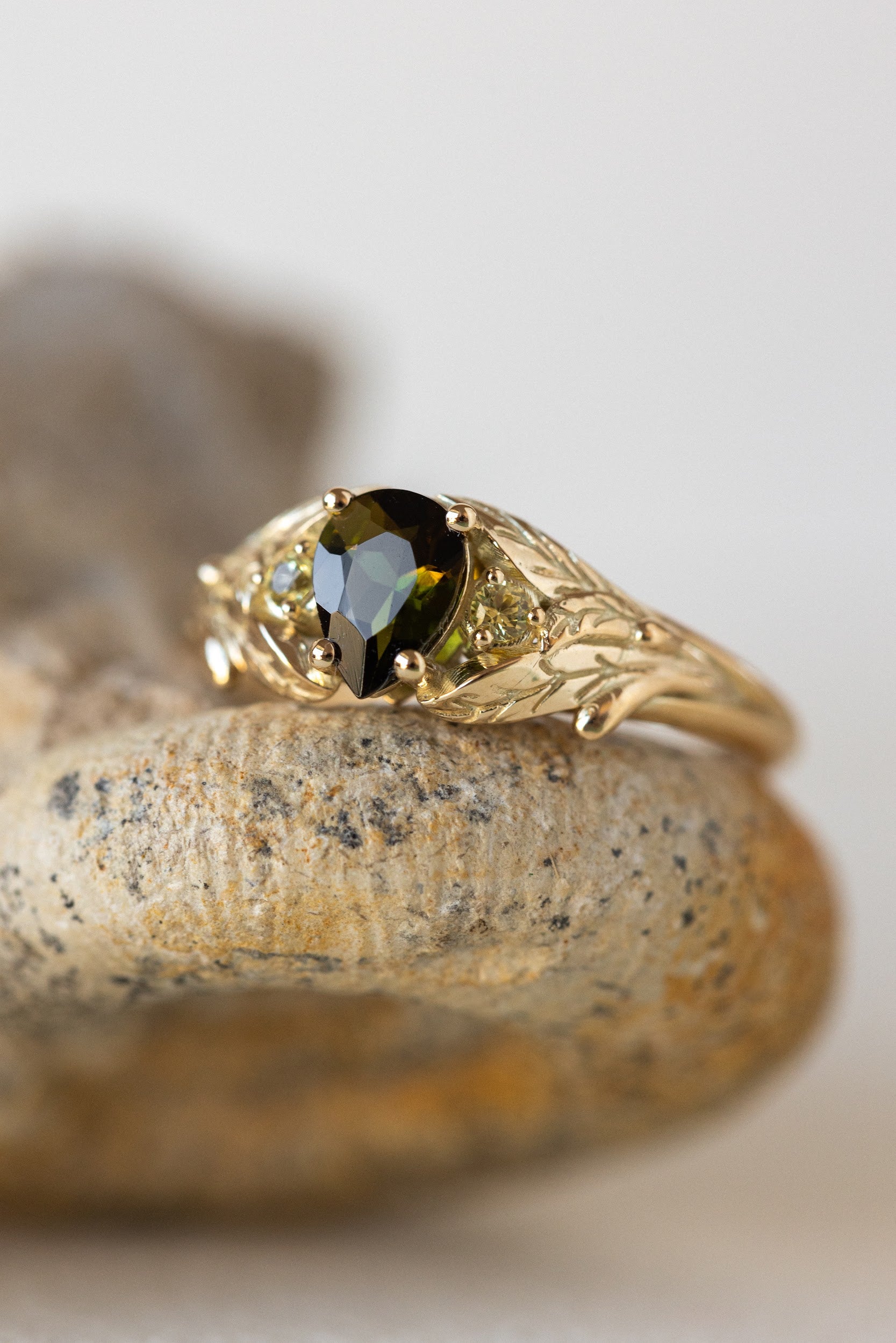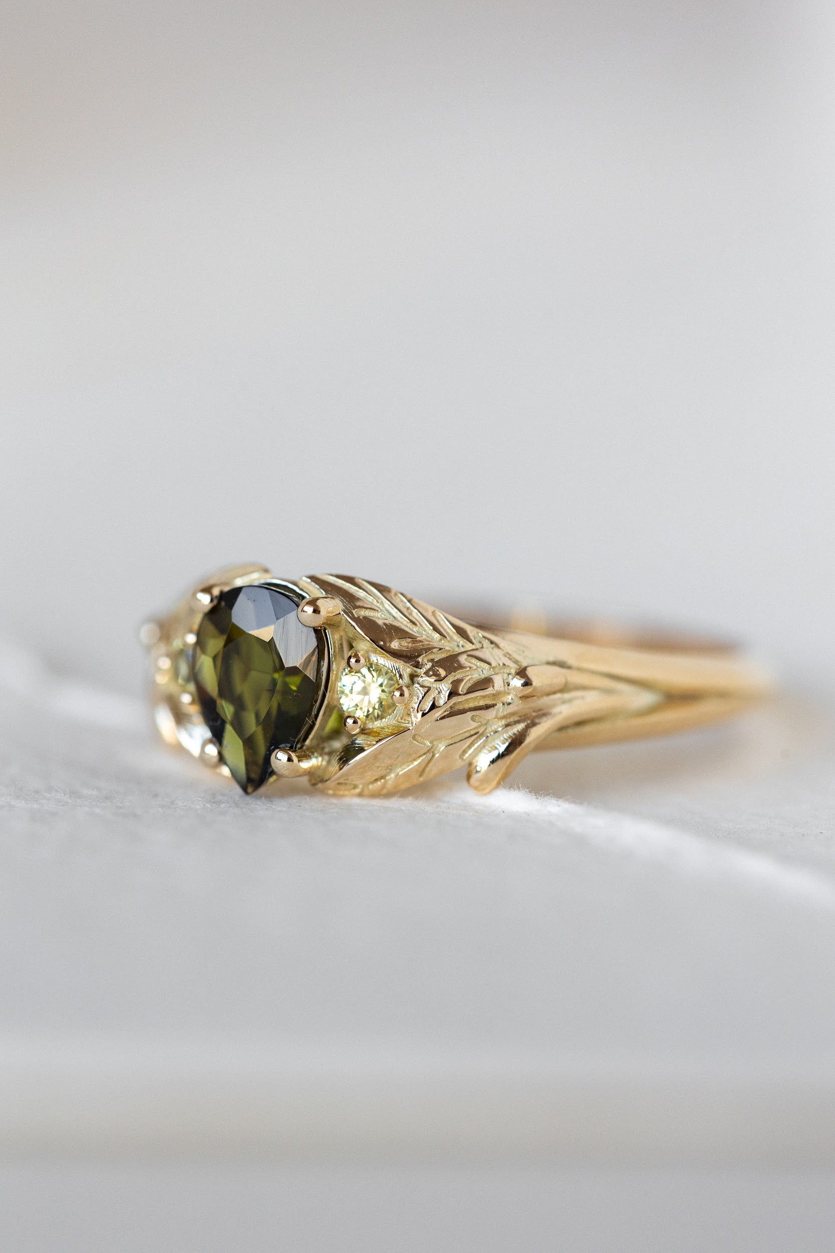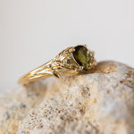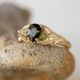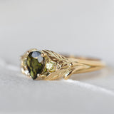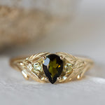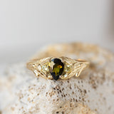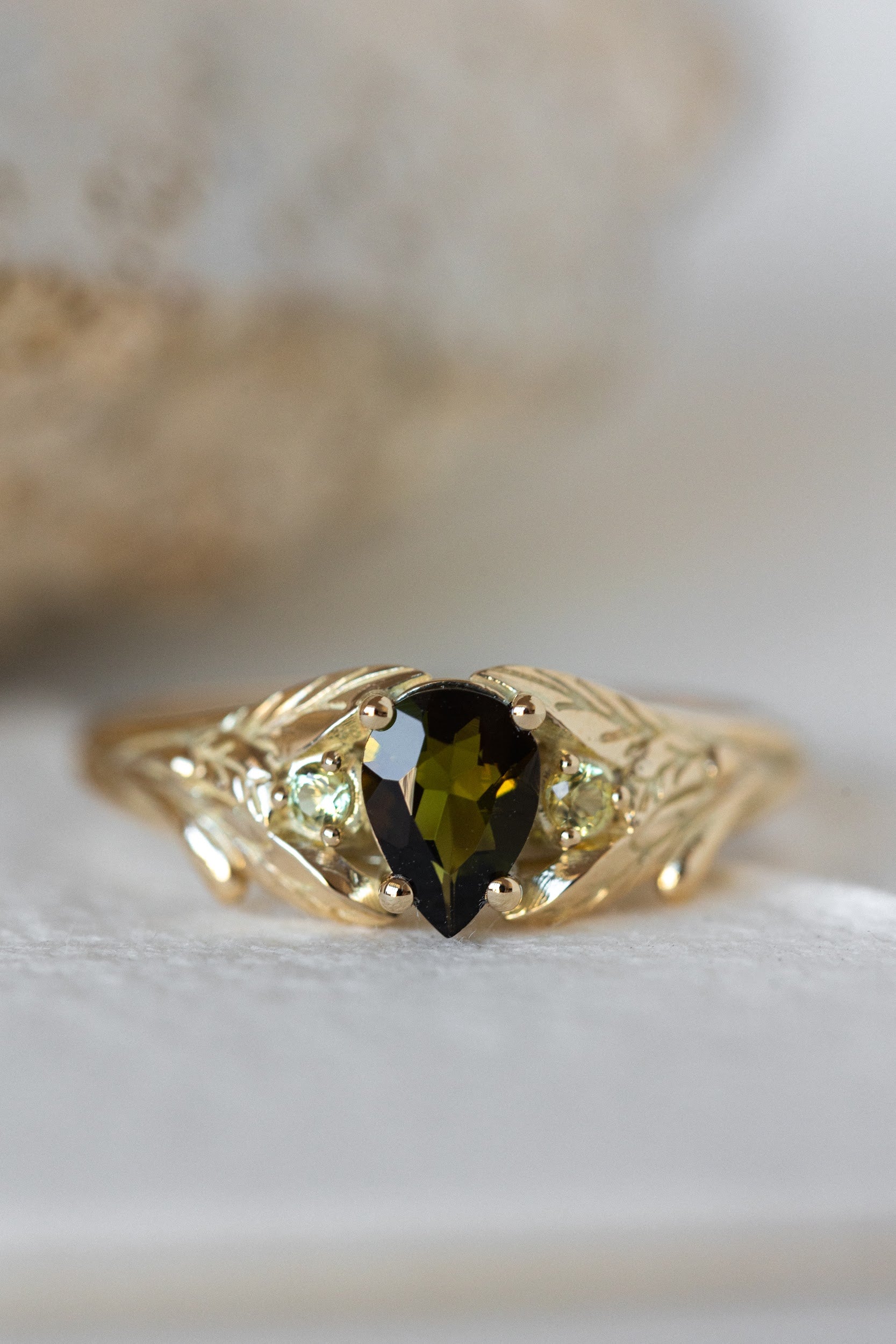 Green tourmaline engagement ring, gold leaf ring with side yellow sapphires