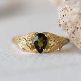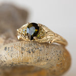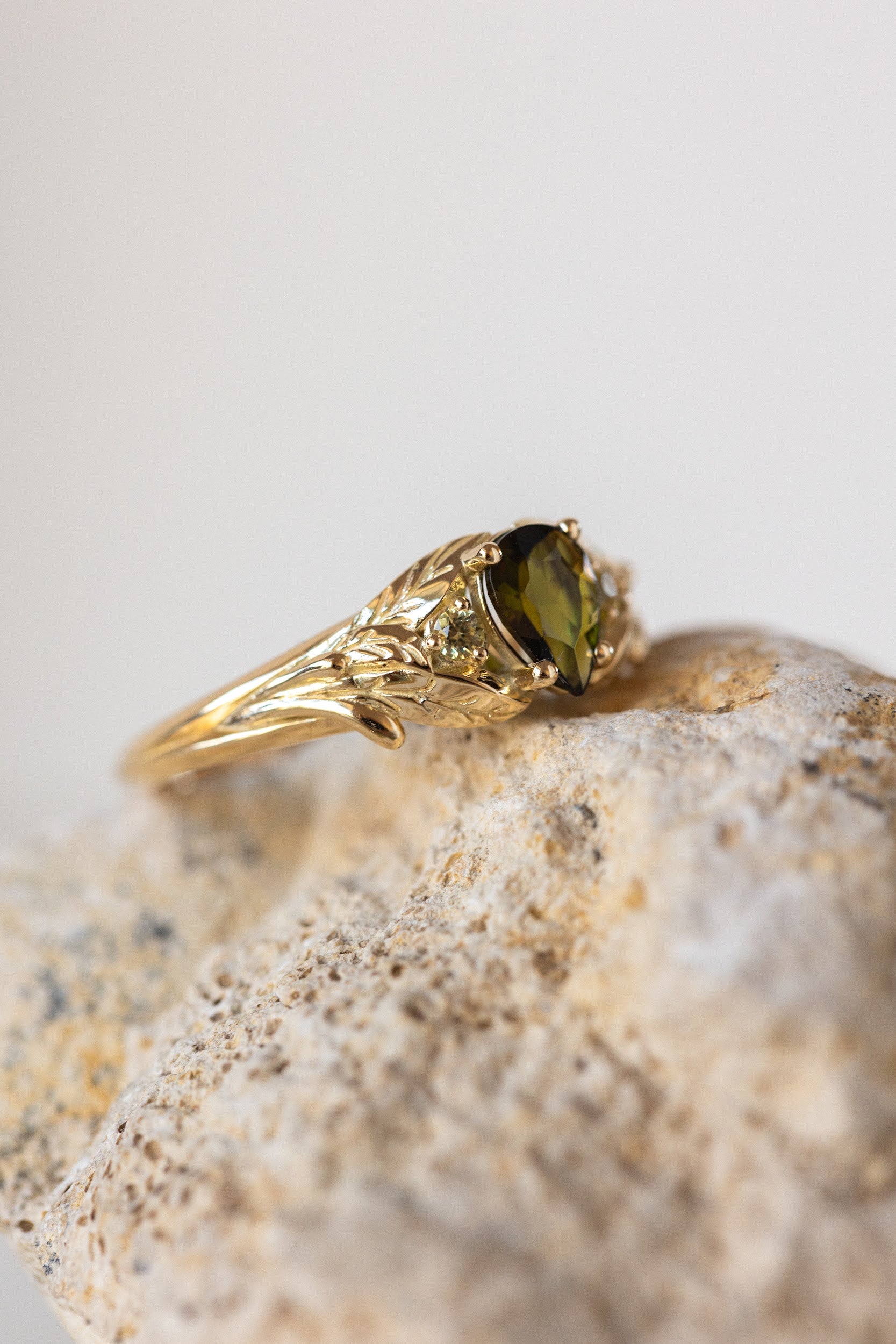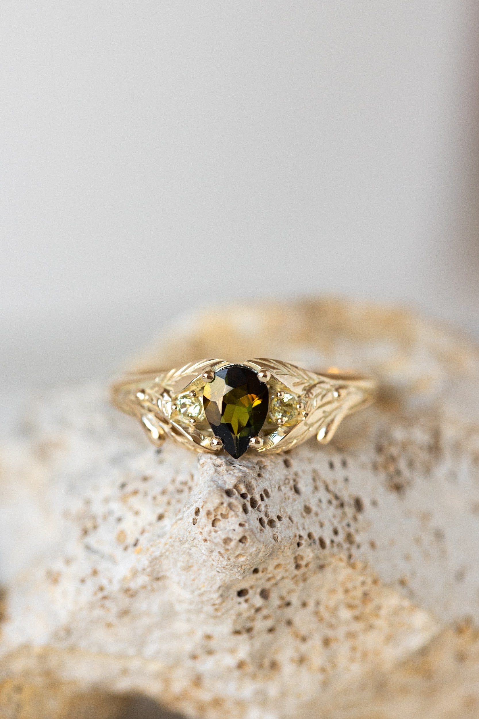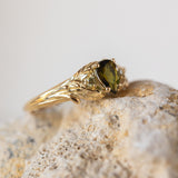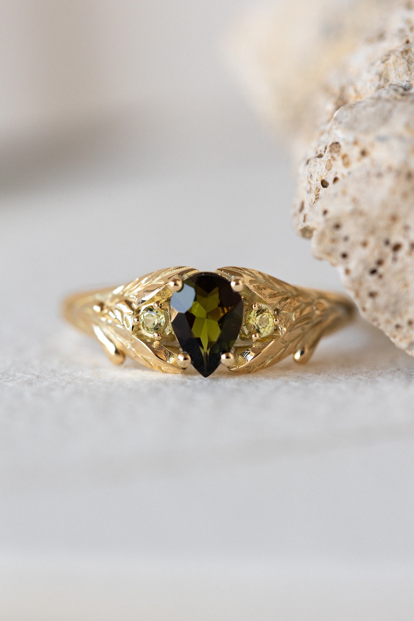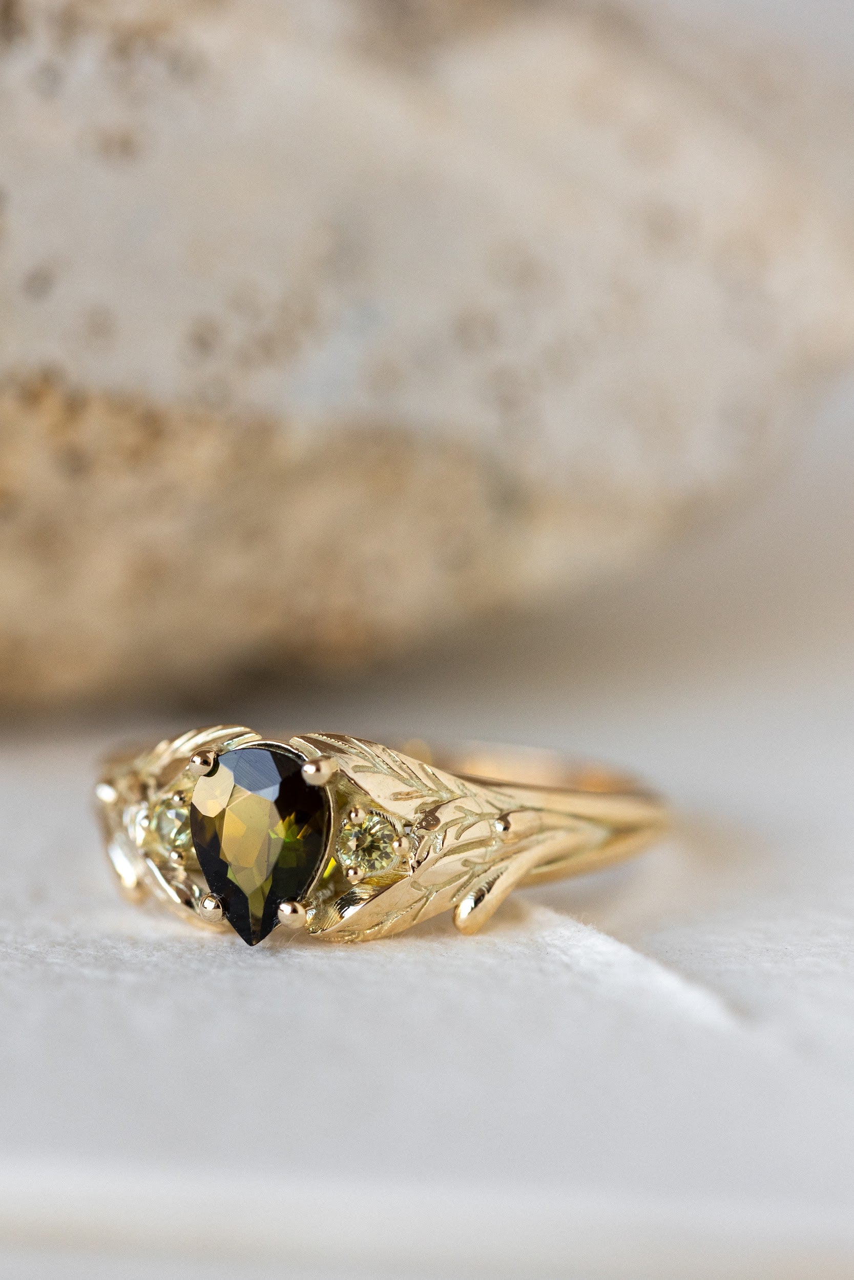 Green tourmaline engagement ring, gold leaf ring with side yellow sapphires