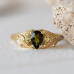 Green tourmaline engagement ring, gold leaf ring with side yellow sapphires / Wisteria