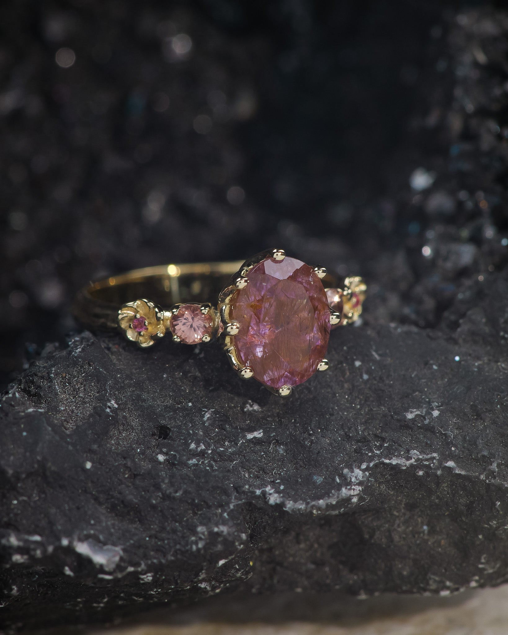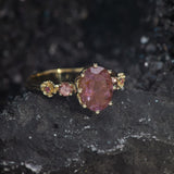Romantic engagement ring features nature-inspired style with an oval cut natural melody quartz. The engagement ring has two tiny flowers on each side and complimented with peach sapphires and pink tourmalines. Central gemstone has an ornate setting, which shows the gemstone in the best way.