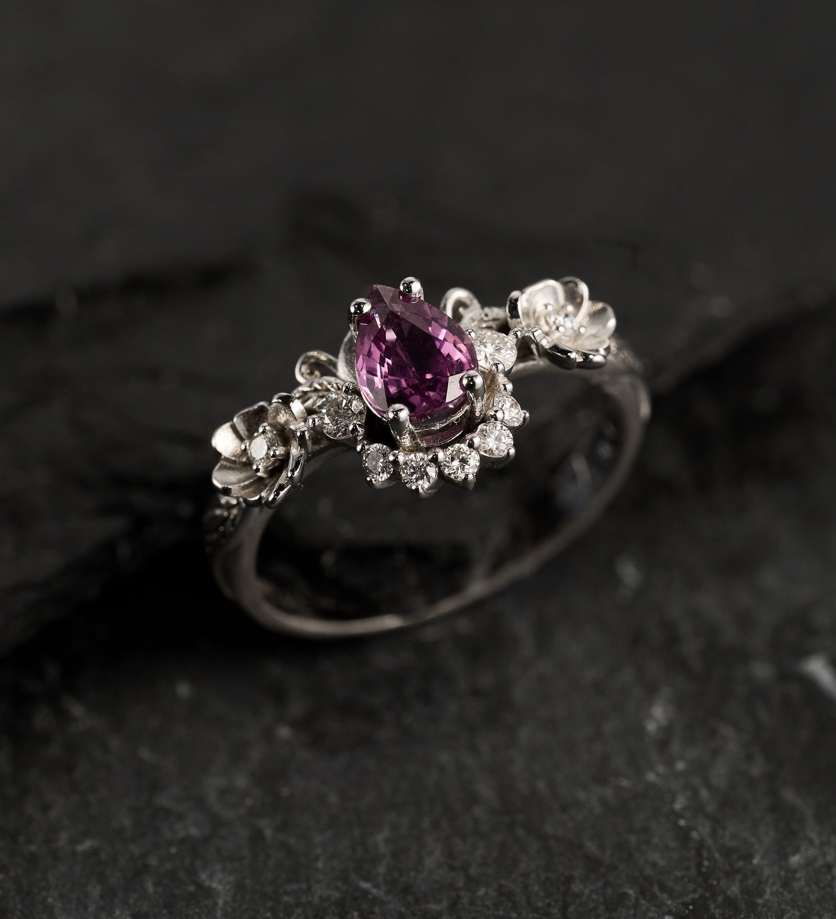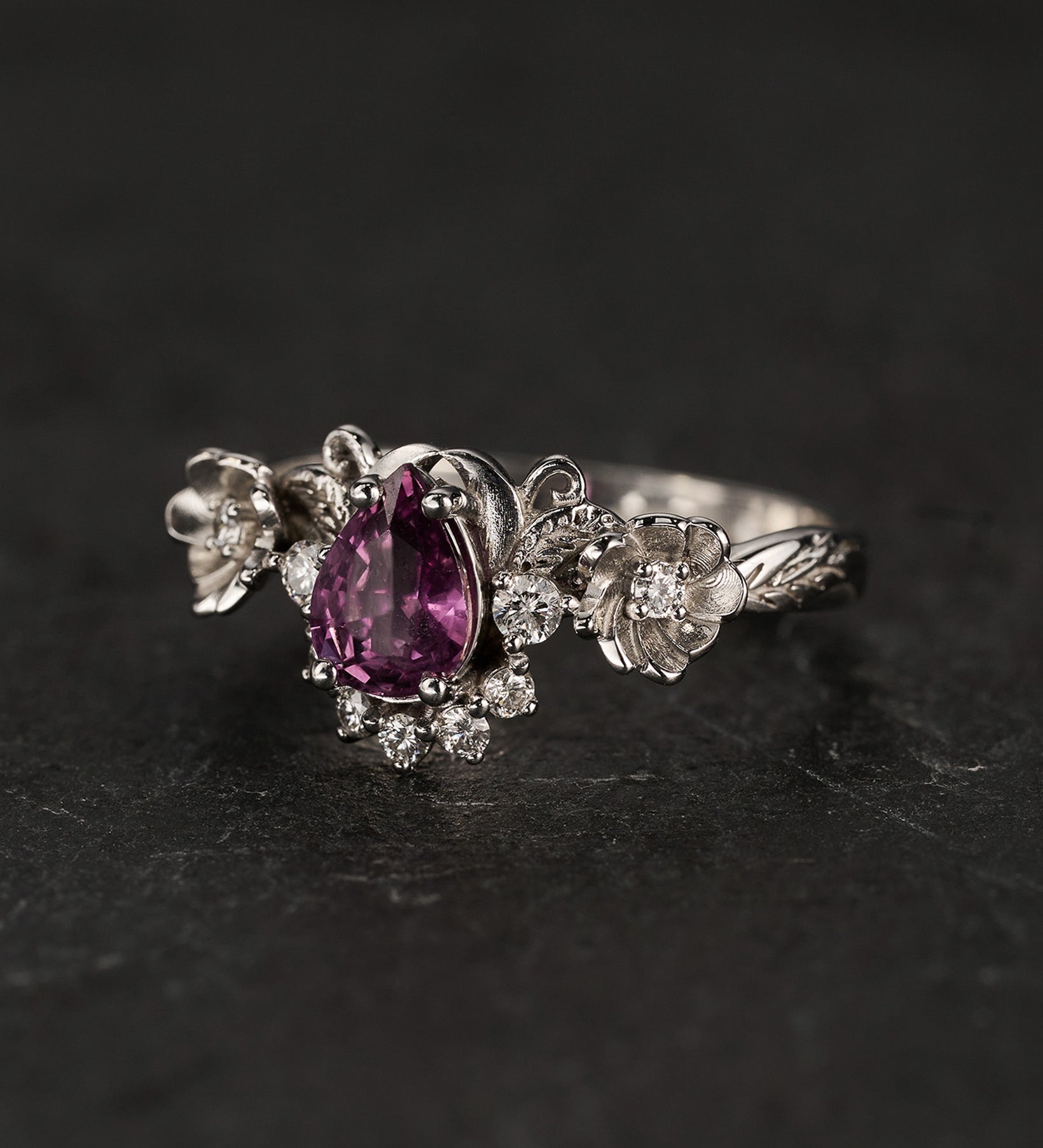 Adelina bridal set shows sophisticated style with a central pear-cut gemstone, two flowers adorned with lab or natural diamonds, and delicate leaves. This version has a diamond crown under the central stone. Unique engagement ring features author's design inspired by nature.