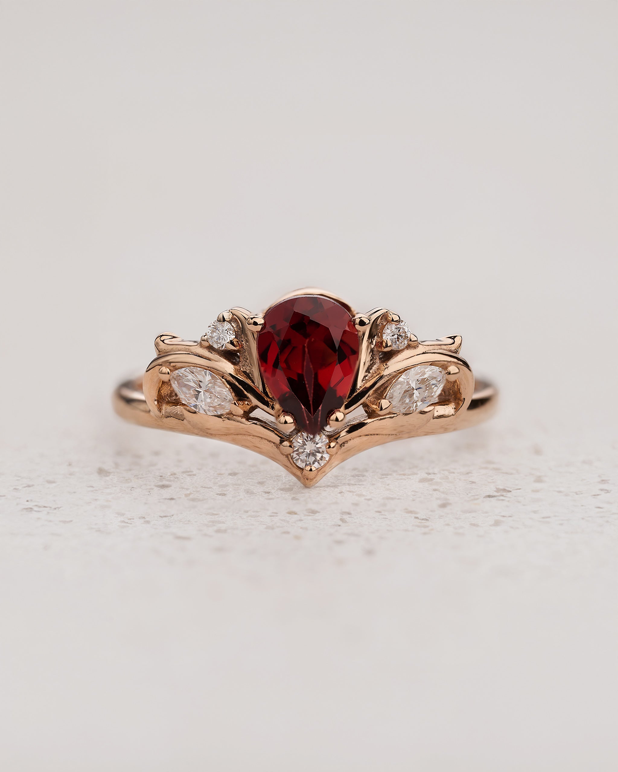 READY TO SHIP Swanlake engagement ring in 14K rose gold, pear garnet 7x5 mm, natural diamonds, AVAILABLE RING SIZES: 5.5 - 8.5 US