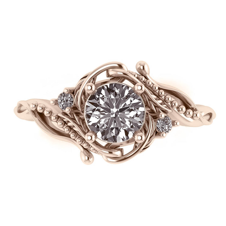 The hypnotising flow of the Art Nouveau style is a feature of this engagement ring. Wavy lines are adorned with enlarged milgrain that resembles water bubbles swirling around the focal gemstone. Flowing stamens and small leaves complete the composition.