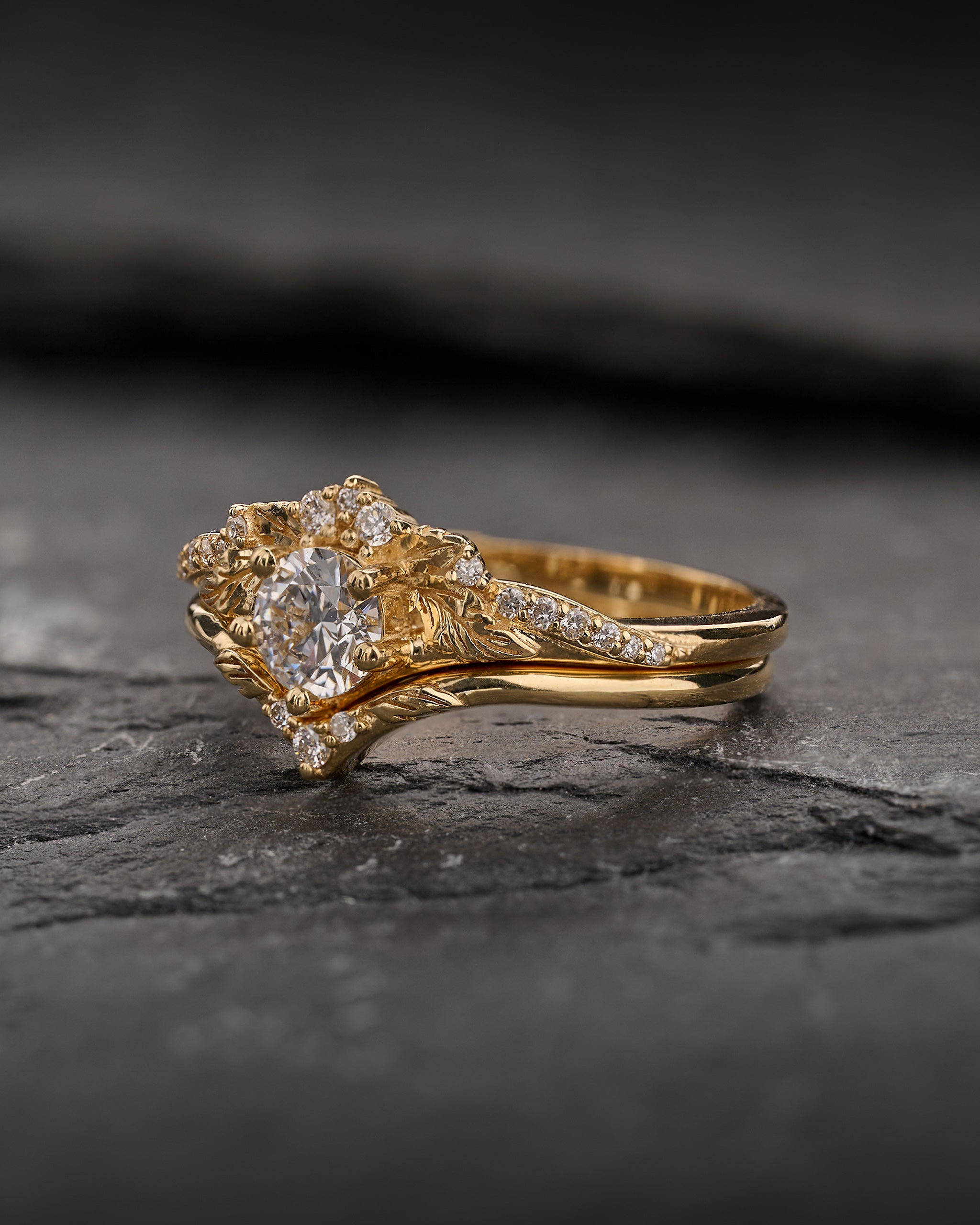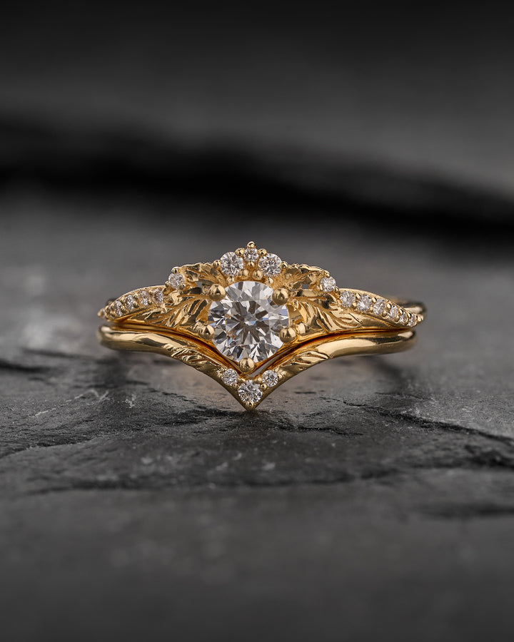 Magnificent wedding ring set features nature inspired design with a highly detailed tiny leaves. Lab grown diamond is complimented with natural sparkling lab grown diamonds or natural diamonds.