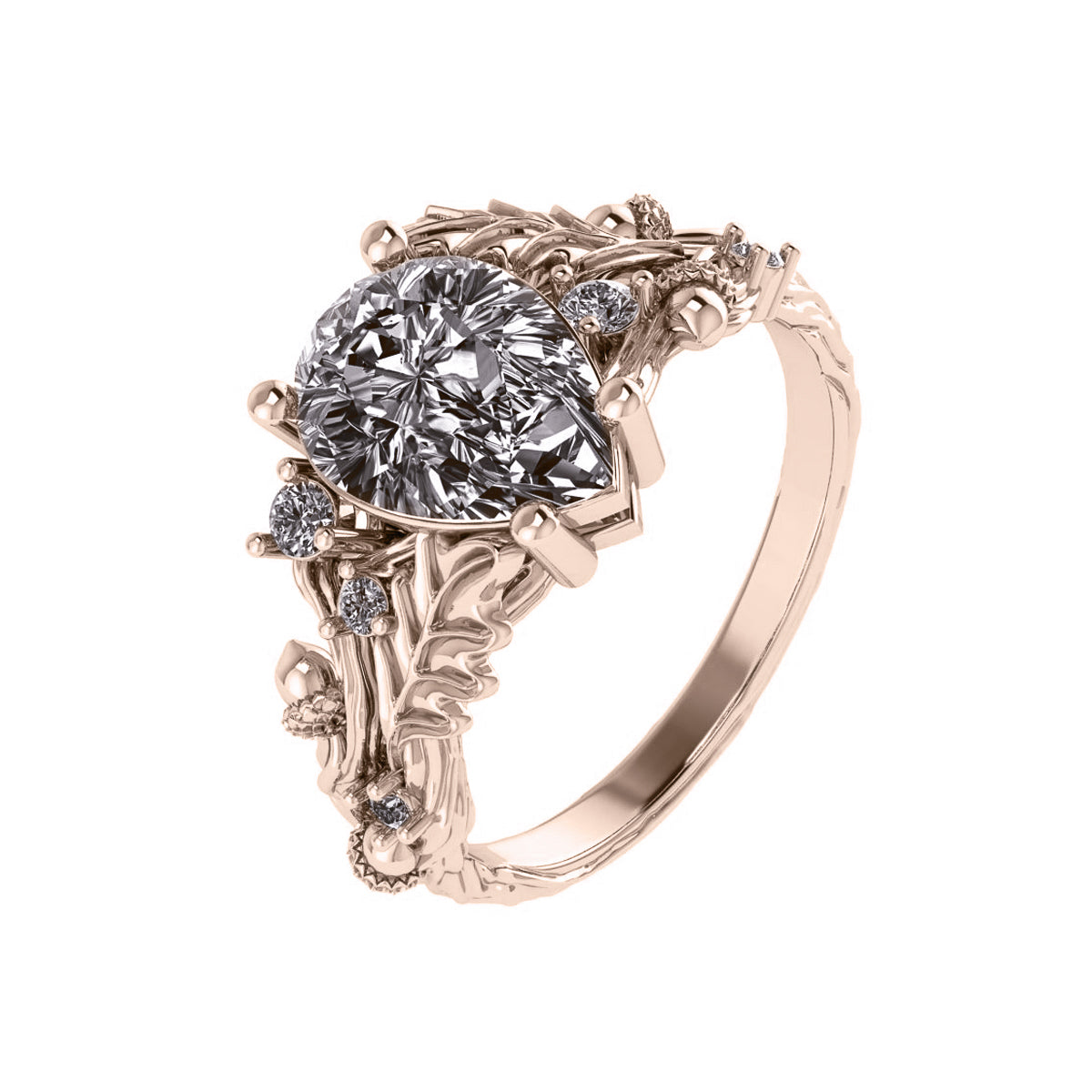 This intricate engagement ring comes straight from the woodland, with a shank that is textured all the way around. Highly detailed gold oak leaves and acorns support the central gemstone, and accent diamonds sparkle among the leaves. Silviya’s asymmetrical design delivers a natural look that is perfect for a lover of the great outdoors.