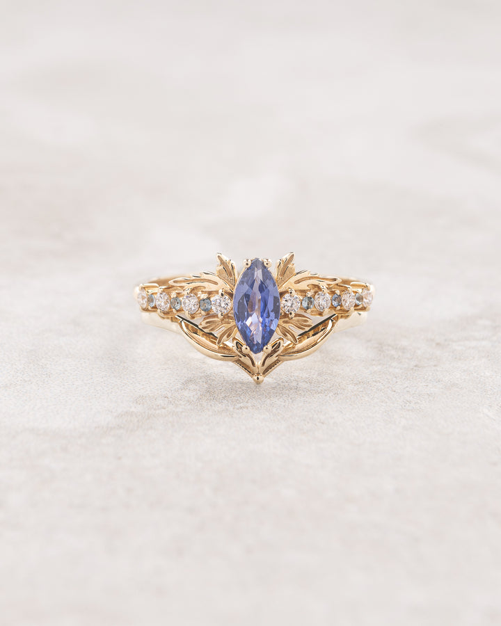 Natural blue sapphire with accents diamonds and blue sapphires engagement ring, nature inspired gold leaf ring