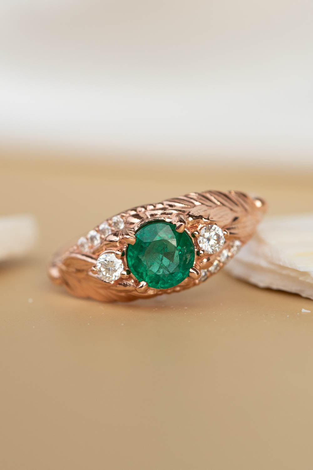 Verdi is one of the most detailed rings in our collection. We combined the best looking elements to create a very special bridal ring set. Two highly detailed palm leaves are wrapping the central gemstone, which is complimented by two side diamonds. Small buds and drops are scattered around as well as a row of tiny diamonds — these details reminds about morning dew and show a lovely sparkle.
