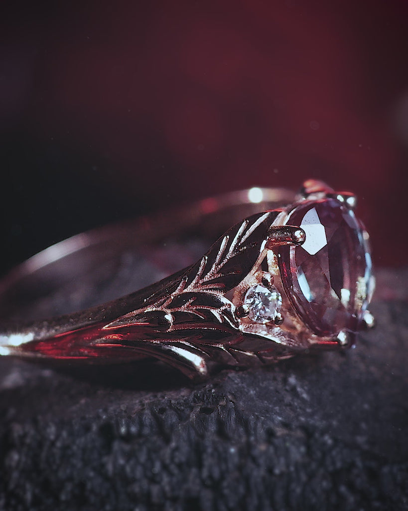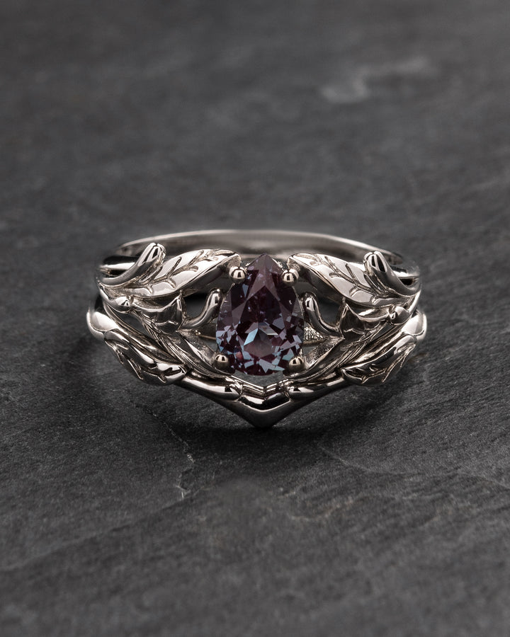 Wisteria ring features teardrop shape gemstone surrounded by detailed gold leaves. This engagement ring is truly magical - gemstone changes colours depending on a lighting.