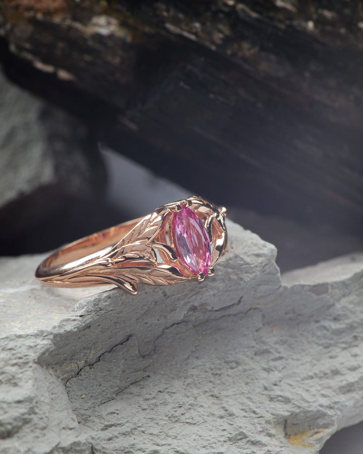 Natural pink sapphire engagement ring, leaf proposal ring with marquise cut gemstone