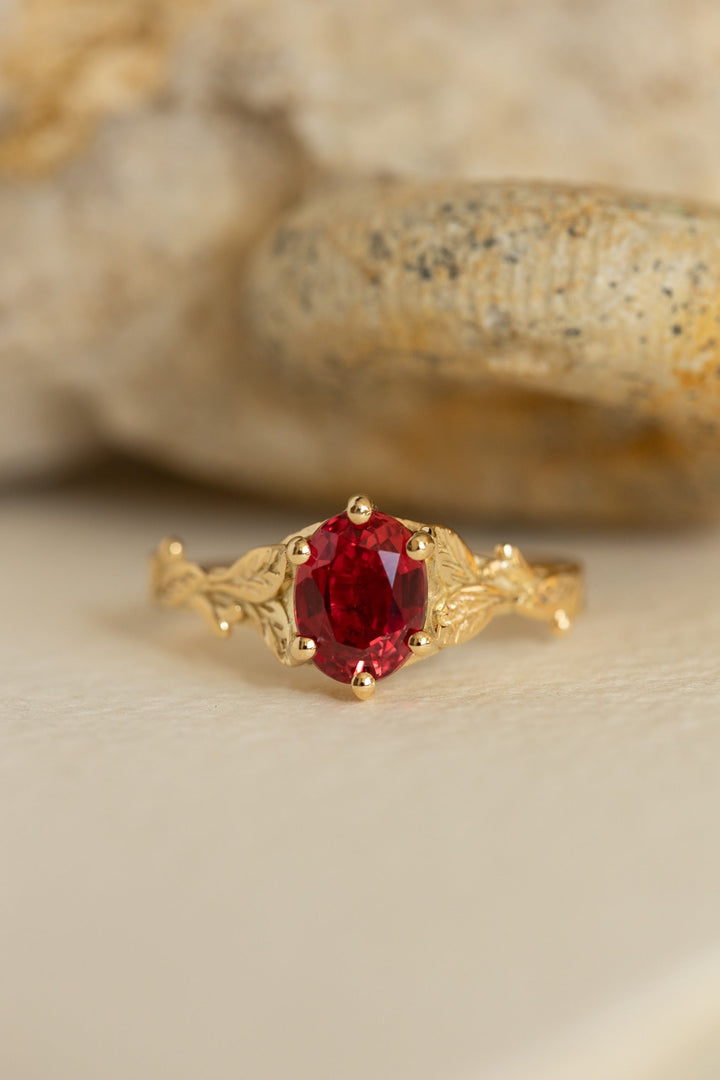 It's all about harmony and romance. Freesia ring will represent your tender feelings and serious intentions in the best way. Handcrafted from solid gold this engagement ring features detailed leaves and organic lines wrapped around the central gemstone.