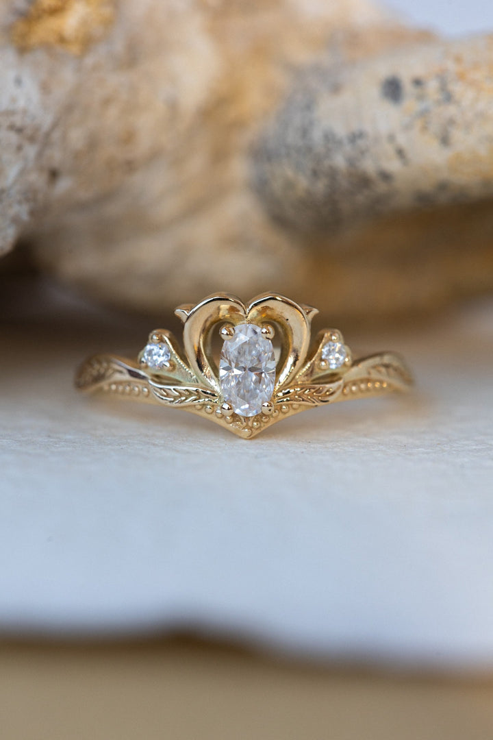 READY TO SHIP: Amura ring in 14K yellow gold, moissanite oval cut 4x3 mm, accent moissanites, AVAILABLE RING SIZES: 3.5 - 6.5 US