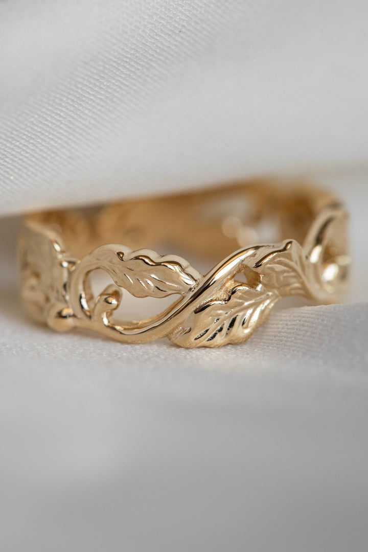 Made with good taste and high attention to details our unisex wedding band features nature inspired style. Ring shows pattern of swirls, oak leaves and small acorns. This is our original design and you won't see it mass produced.