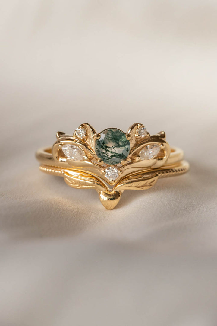 READY TO SHIP: Swanlake set in 14K yellow gold, natural round cut moss agate 5 mm, moissanites, RING SIZE 7.5 - 10.5 US