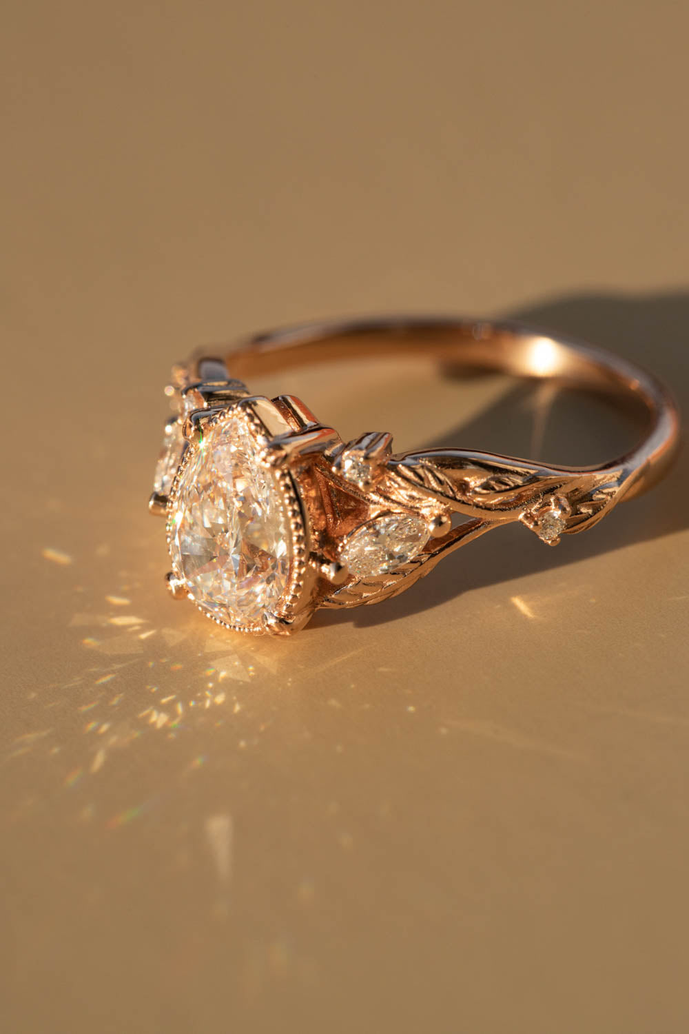 The asymmetrical Patricia ring shows an intricate design of vines and leaves that weave together in a natural way. Side gemstones are scattered between the twigs - marquise cut gemstones resemble leaf shapes and small round cuts look like shiny morning dew. The central gemstone has a beaded frame around it, adding extra detail.