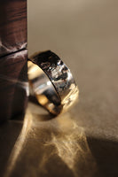This man's band has a wide profile with a unique texture of naturally melted metal. It has an original yet minimal look, great for those who're looking for a stylish wedding ring suitable for everyday wear. It will be made in the requested size and desirable gold colour.
