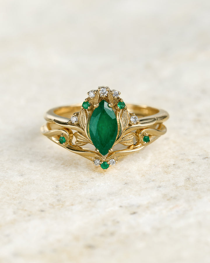 Make a statement of love and elegance with the enchanting Iris bridal set. This nature-inspired masterpiece is a unique ring set that captures the essence of beauty and romance. Reminiscent of a blooming Iris flower bud, the engagement ring features exceptional detailing and a foliage crown sculpted around a marquise-cut natural emerald.