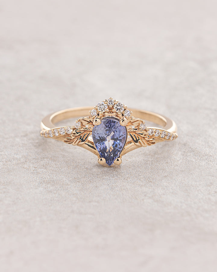 The magnificent engagement ring features a nature-inspired design with highly detailed tiny leaves. Natural sapphire is complimented with natural or lab-grown sparkling diamonds of your choice.