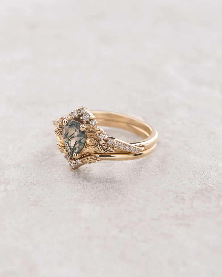 Magnificent wedding ring set features nature inspired design with a highly detailed tiny leaves. Natural pear cut moss agate is complimented with natural o manmade sparkling diamonds.