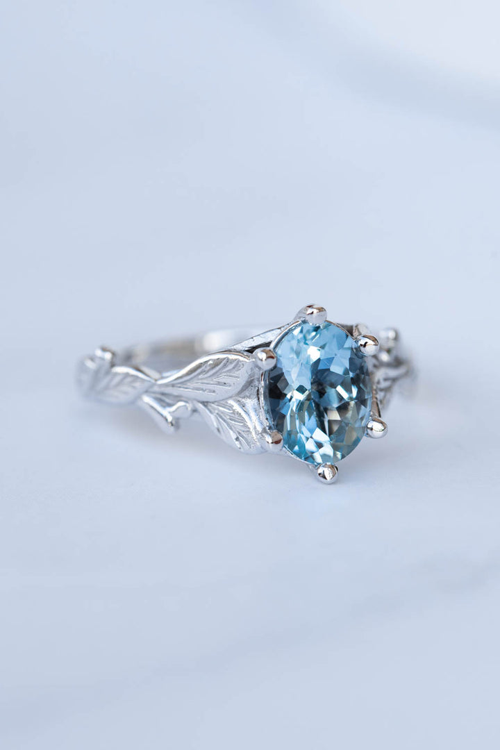 Aquamarine gold engagement ring, white gold leaves promise ring