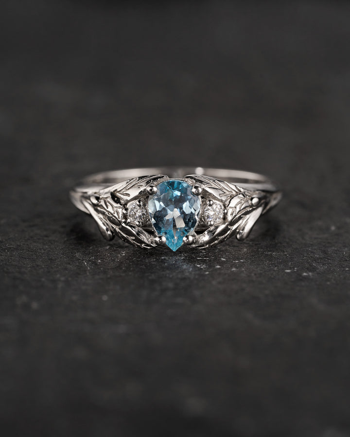 This Wisteria engagement ring features nature inspired design with leaves wrapping around beautiful natural aqumarine. Adorned with round accent stones, placed between skilfully made leaves.