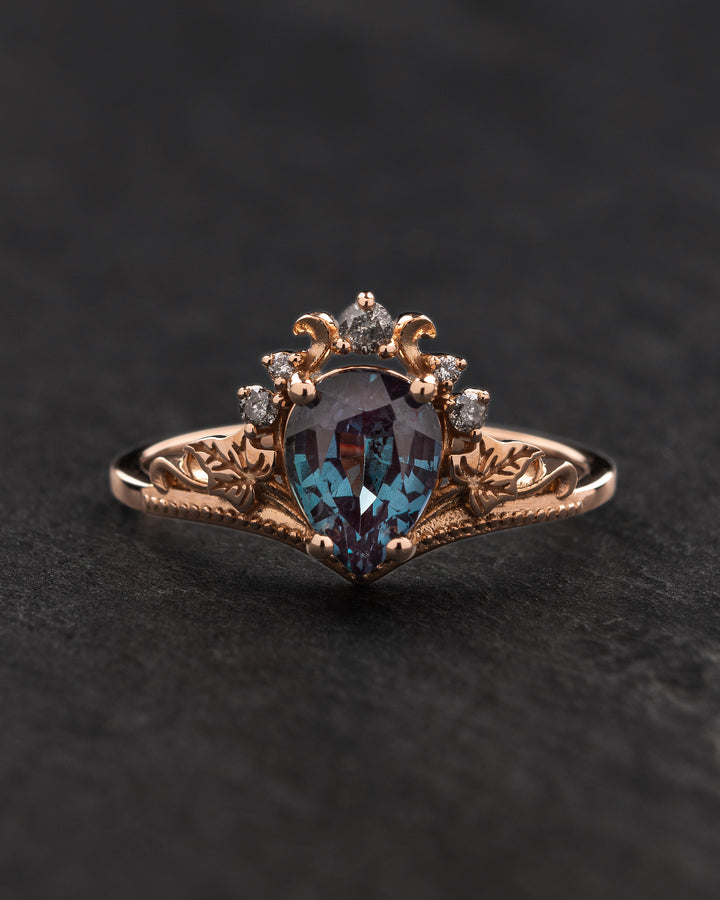 Baroque magnificence and lightness shown in this hand-sculpted engagement ring. Our Ariadne rings feature nature inspired style with tiny ivy leaves and the most delicate swirls you can imagine. Colour changing alexandrite has gorgeous purple colour complimented with natural salt and pepper diamonds. Tiara shaped engagement ring will make her breathless by it's sophisticated and timeless design.