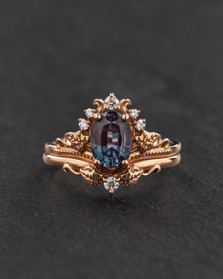 Magnificent wedding ring set features nature inspired style with tiny ivy leaves and the most delicate details you can imagine. Oval cut lab alexandrite has great colour changing properties. Small accent lab grown or natural diamonds compliments this romantic jewelry piece.