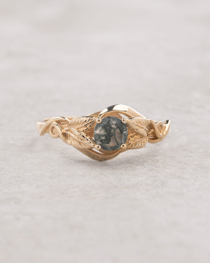 It's all about harmony and romance. Azalea ring will represent your tender feelings and serious intentions in the best way. Handcrafted from solid gold this engagement ring features detailed leaves and organic lines wrapped around the central gemstone.