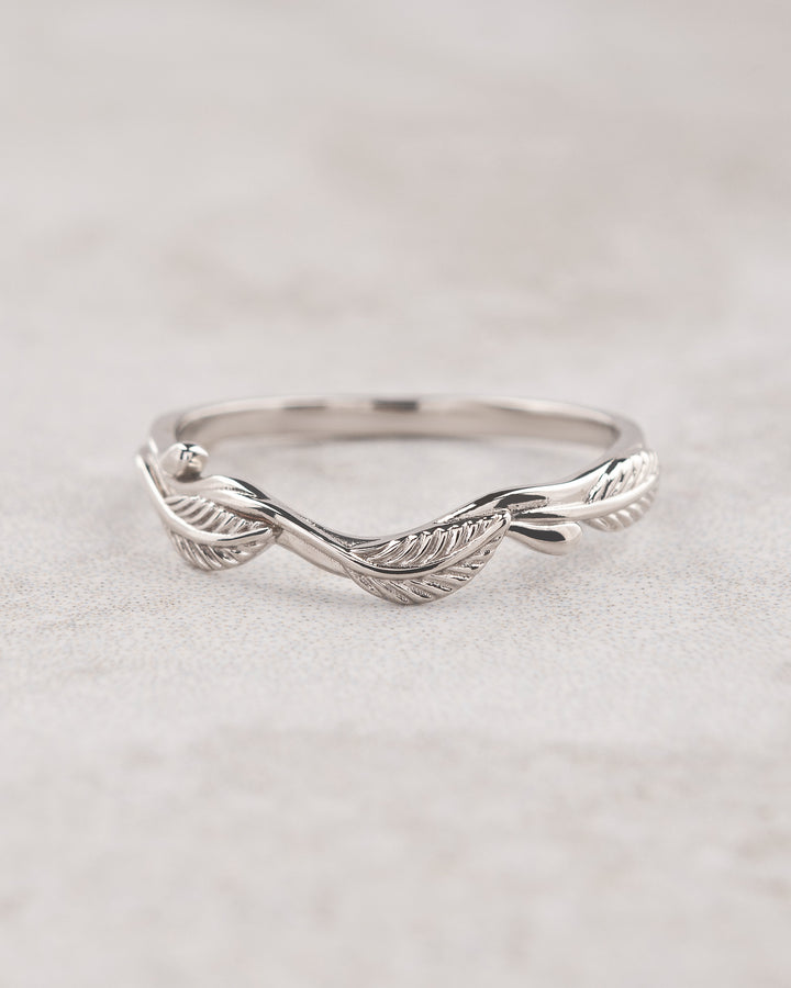 Designed especially as a matching wedding band for our Azalea engagement ring, it can be used alone as well. Gold twig ring features rustic design with three leaves and a natural curve.