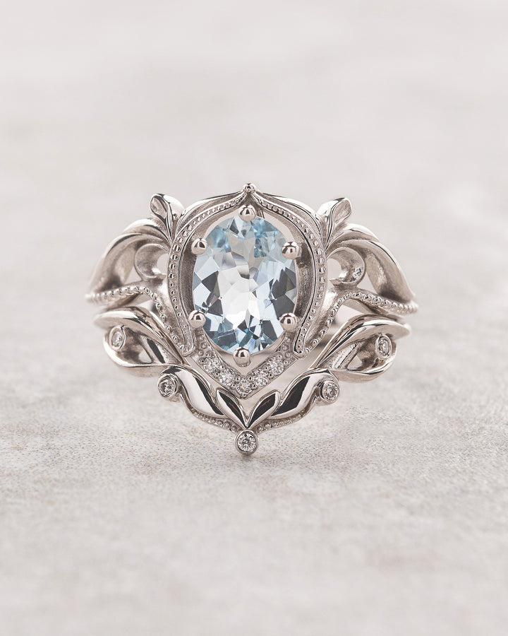 This listing is for the set of two rings: Lida engagement ring with oval cut aquamarine and chevron style matching band with diamonds.