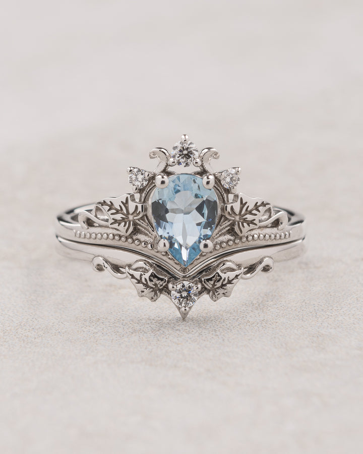 Magnificent wedding ring set features nature inspired style with tiny ivy leaves and the most delicate details you can imagine. This version comes with pear cut gemstone - natural blue aquamarine.