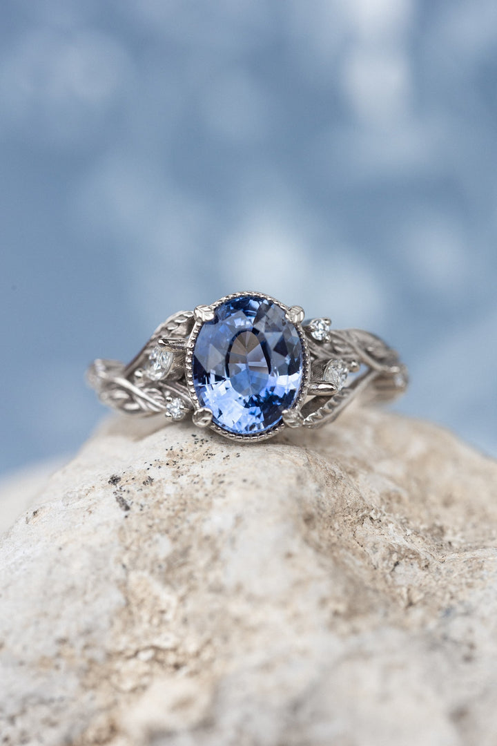 READY TO SHIP: Patricia ring in 14K white gold, natural blue sapphire 8.8x6.6 mm, accent natural diamonds, AVAILABLE RING SIZES: 5.5 - 8.5 US