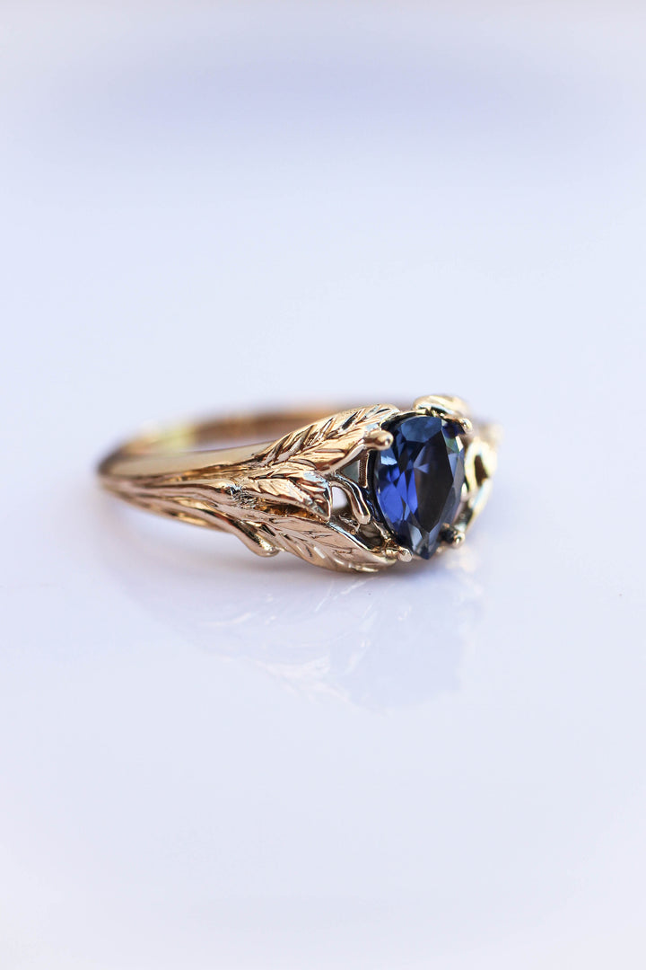Wisteria ring is designed with taste and high attention to details. Gold leaves wraps pear cut stone in a natural way. This engagement ring has a comfortable shank and will catch attention with sapphire's gorgeous rich colour.