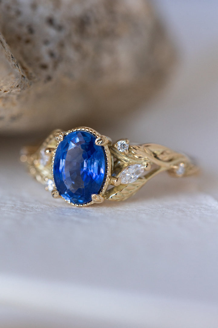 READY TO SHIP: Patricia ring in 14K yellow gold, natural vivid blue sapphire 8x6 mm, accent natural diamonds, AVAILABLE RING SIZES: 5.5 - 8.5 US