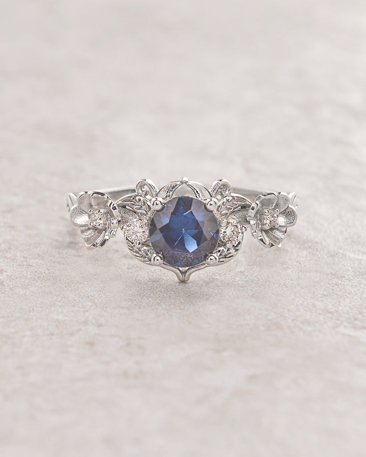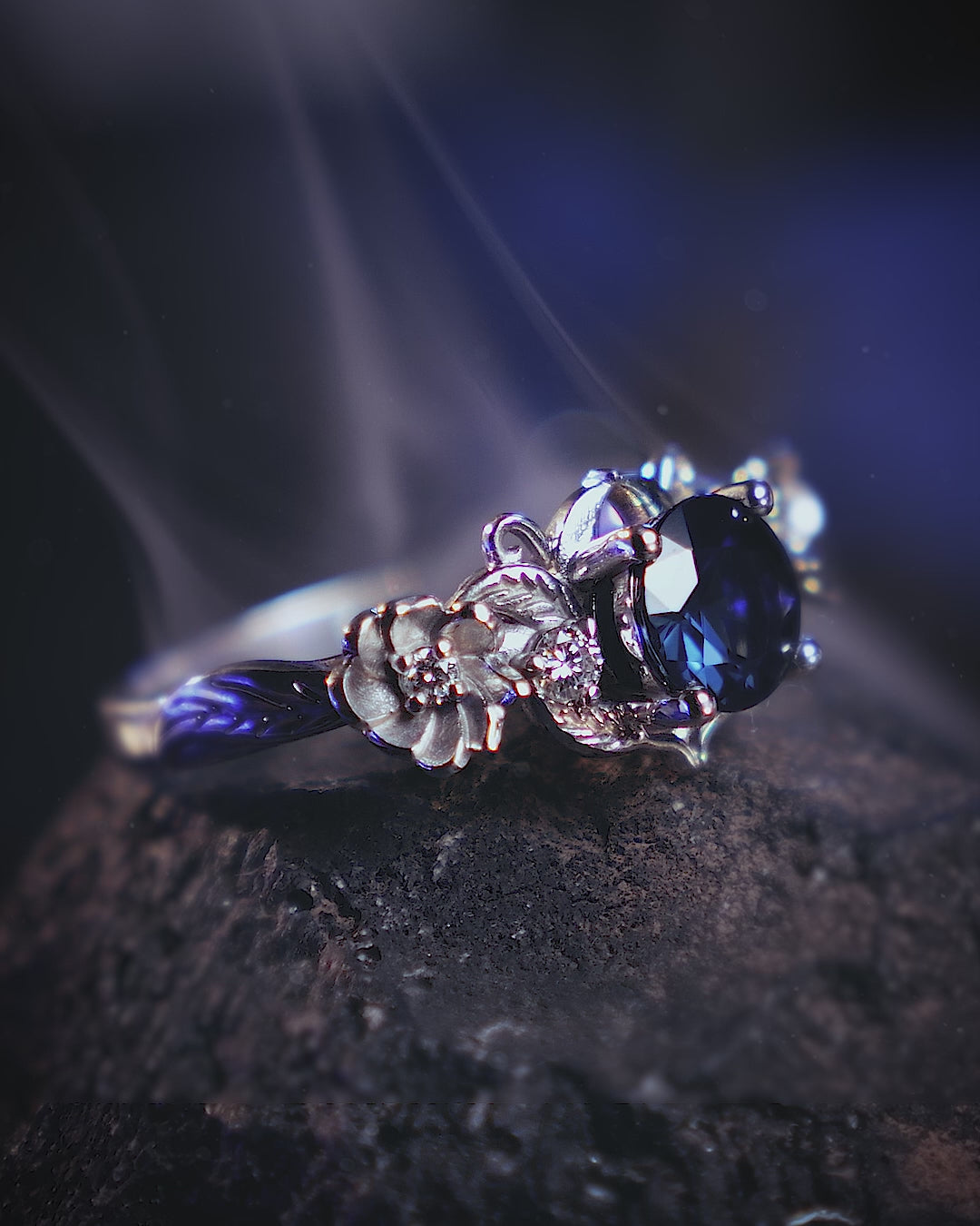 Deep blue sapphire engagement ring, floral ring with diamonds