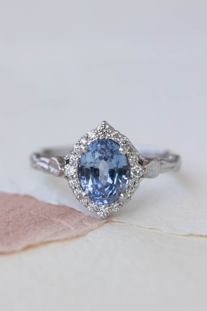 Blue sapphire engagement ring, white gold leaf ring with diamond halo / Florentina