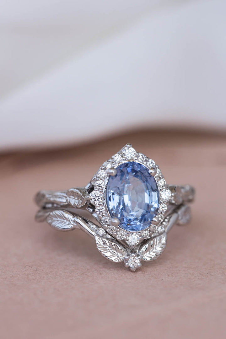 Genuine light blue sapphire bridal ring set, diamond halo nature inspired engagement ring set