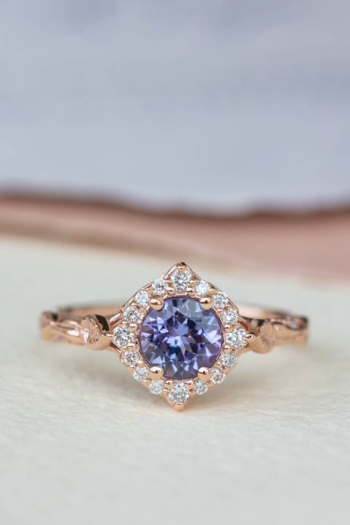 Lavender tanzanite engagement ring with diamond halo, rose gold leaves ring with diamonds