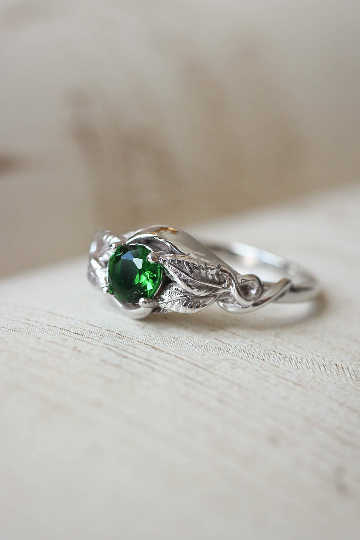 Our leaf engagement Azalea ring may be an exquisite and unique gift for your wife, bride, girlfriend or any other special woman in your life. Handcrafted from recycled solid gold it is adorned with round cut lab emerald. Sustainable choice and perfect appearance. Check other variations or feel free to request custom design.