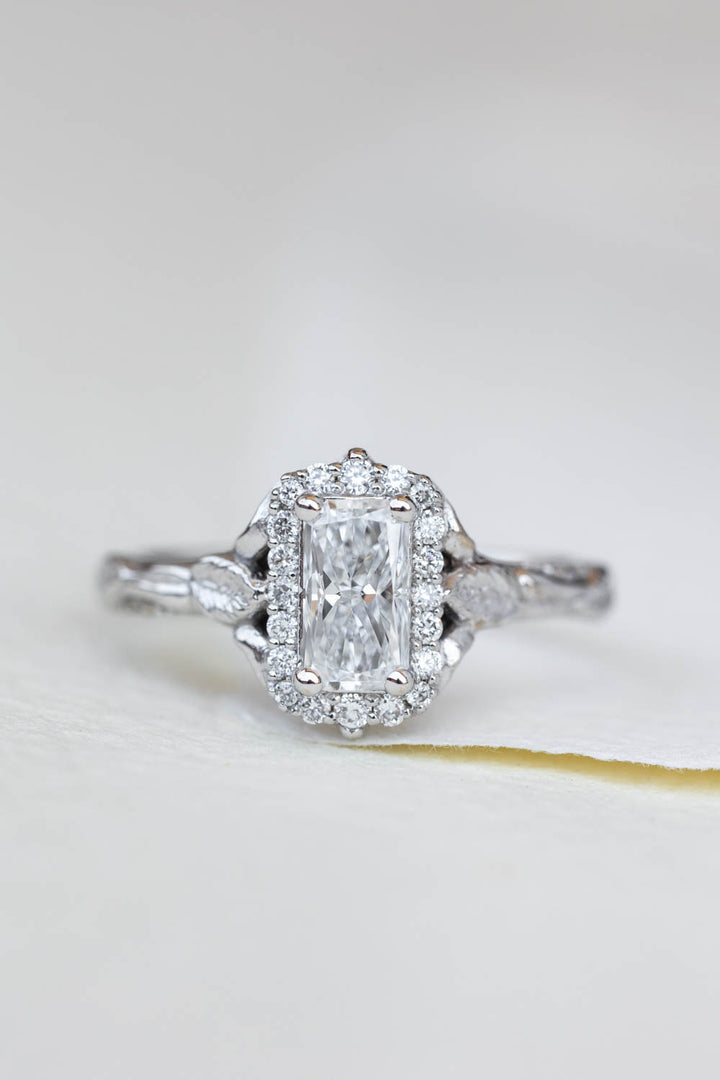 Nature inspired engagement ring with lab grown diamonds, gorgeous bridal ring with diamond halo