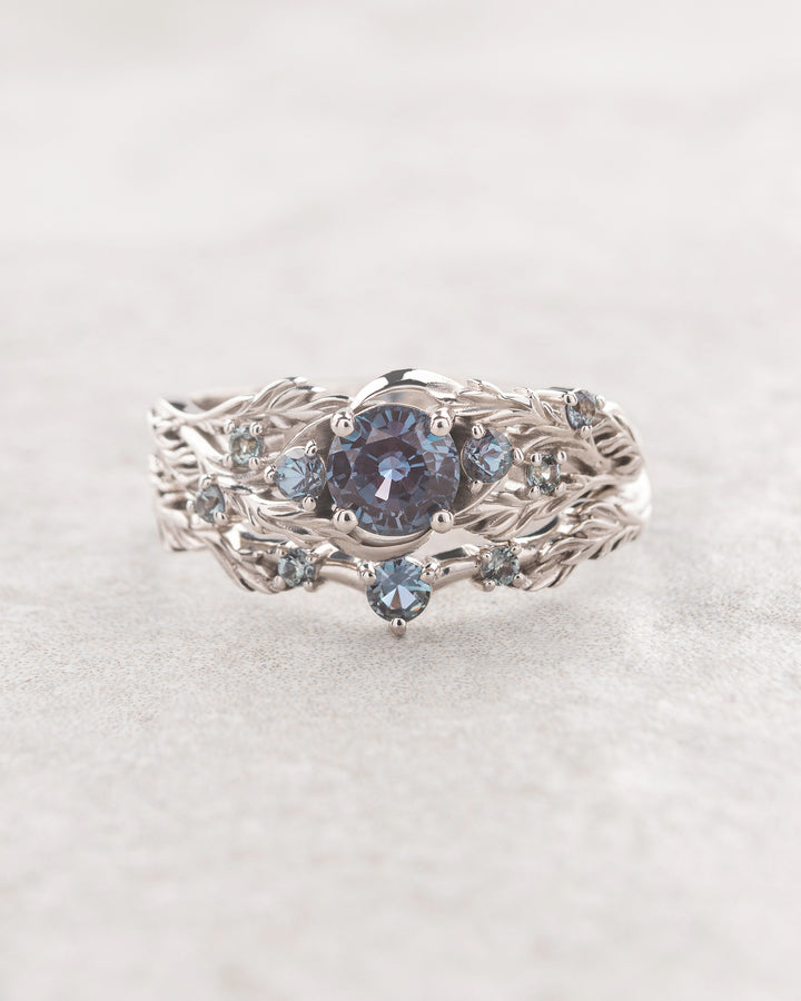 This listing is for the set of two rings: Nature inspired alexandrite engagement ring and matching leaves band with alexandrites