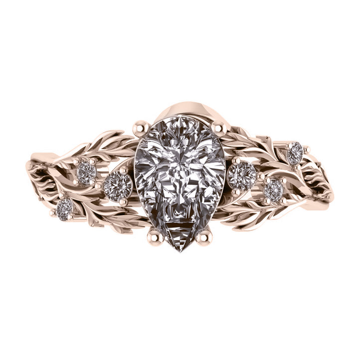 Delicately sculpted, this leaves band would be perfect for the alternative engagement ring seeker. Highly detailed Japanese maple leaves wrap around the central pear-cut gemstone. Sparkling diamonds are scattered among the gold leaves, evoking dew in the forest.